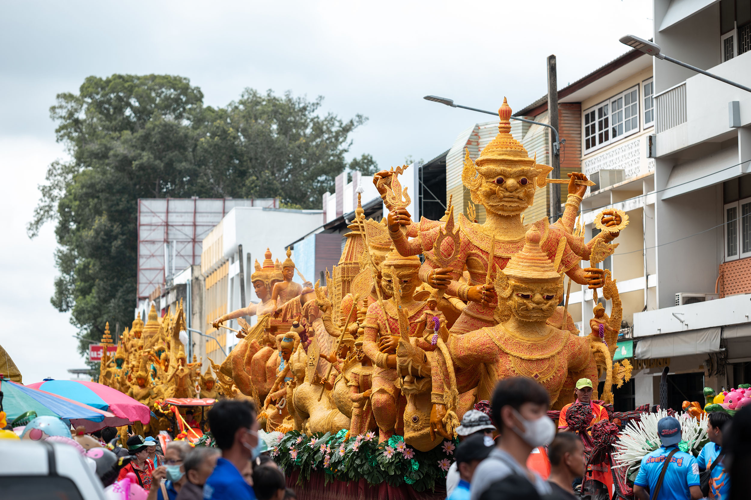 สำหรับปีนี้ ต้นเทียนของวัดศรีประดู่ ส่งต่อภูมิปัญญาทางศิลป์ ควบคู่กับการสร้างแรงบันดาลใจ “สืบศิลป์ สานแสง ส่องวัฒนธรรมให้คนรุ่นใหม่” เป็นผลงานการรังสรรค์ต้นเทียนทั้งขบวนให้ทำหน้าที่ถ่ายทอดเรื่องราวสำคัญในพุทธประวัติ ตอน “มหากาพย์แห่งชัยชนะของพุทธะ” โดยใช้เทคนิคติดพิมพ์ลวดลายโบราณบนต้นเทียน โดยเฉพาะลาย "ดอกกาละกับ" ที่เป็นสัญลักษณ์แห่งรากวัฒนธรรมล้านช้าง และยังนำ “ธรรมาสน์สิงห์ยืนเทินบุษบก บ้านชีทวน” ผลงานศิลป์ท้องถิ่นที่มีหนึ่งเดียวในโลก มาเป็นแรงบันดาลใจในส่วนของโครงสร้างช่วงท้ายของขบวนเทียน เพื่อสะท้อนความศรัทธาที่ฝังรากลึกของผู้คนและชุมชนภาคอีสานอีกด้วย