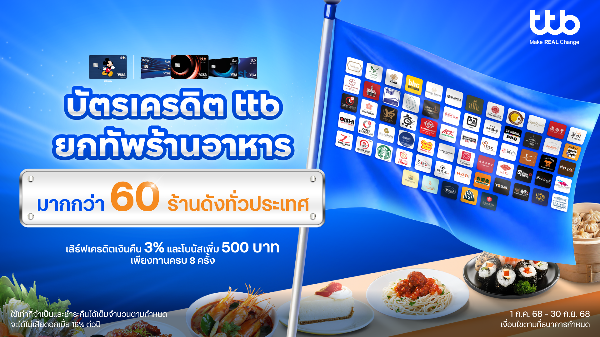 17 กรกฎาคม 2568 : ทีเอ็มบีธนชาต หรือ ทีทีบี ชวนสายกินมาร่วมสัมผัสประสบการณ์จัดเต็มความอร่อยที่จะเปลี่ยนทุกมื้ออาหารให้ได้รับความคุ้มค่าและฟินยิ่งกว่าเดิม! ด้วยการเปิดแคมเปญใหญ่แห่งปี “ยกทัพกินจริงจัง” โดยทีทีบีได้จับมือกับพันธมิตรรวมร้านอาหารมากกว่า 60 ร้านดังทั่วประเทศ เพื่อลูกค้าบัตรเครดิต ttb บัตรเครดิต ttb Global House และบัตรเครดิต ttb Disney ให้ได้รับสิทธิพิเศษส่วนลดค่าอาหารและเครดิตเงินคืนที่ทำให้อิ่มอร่อย คุ้มค่ามากกว่าในทุกการใช้จ่าย ตั้งแต่วันที่ 1 กรกฎาคม 2568 – 30 กันยายน 2568