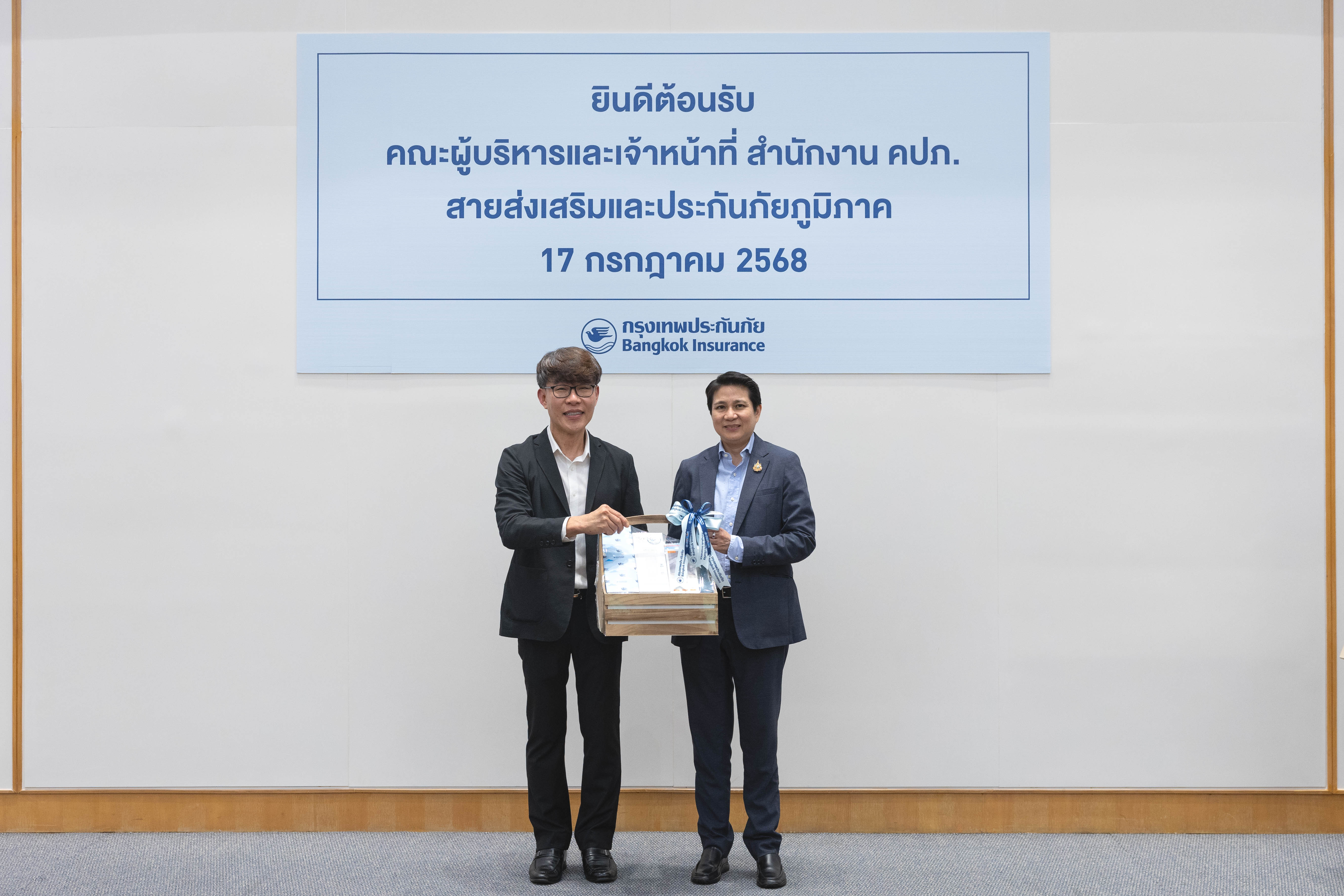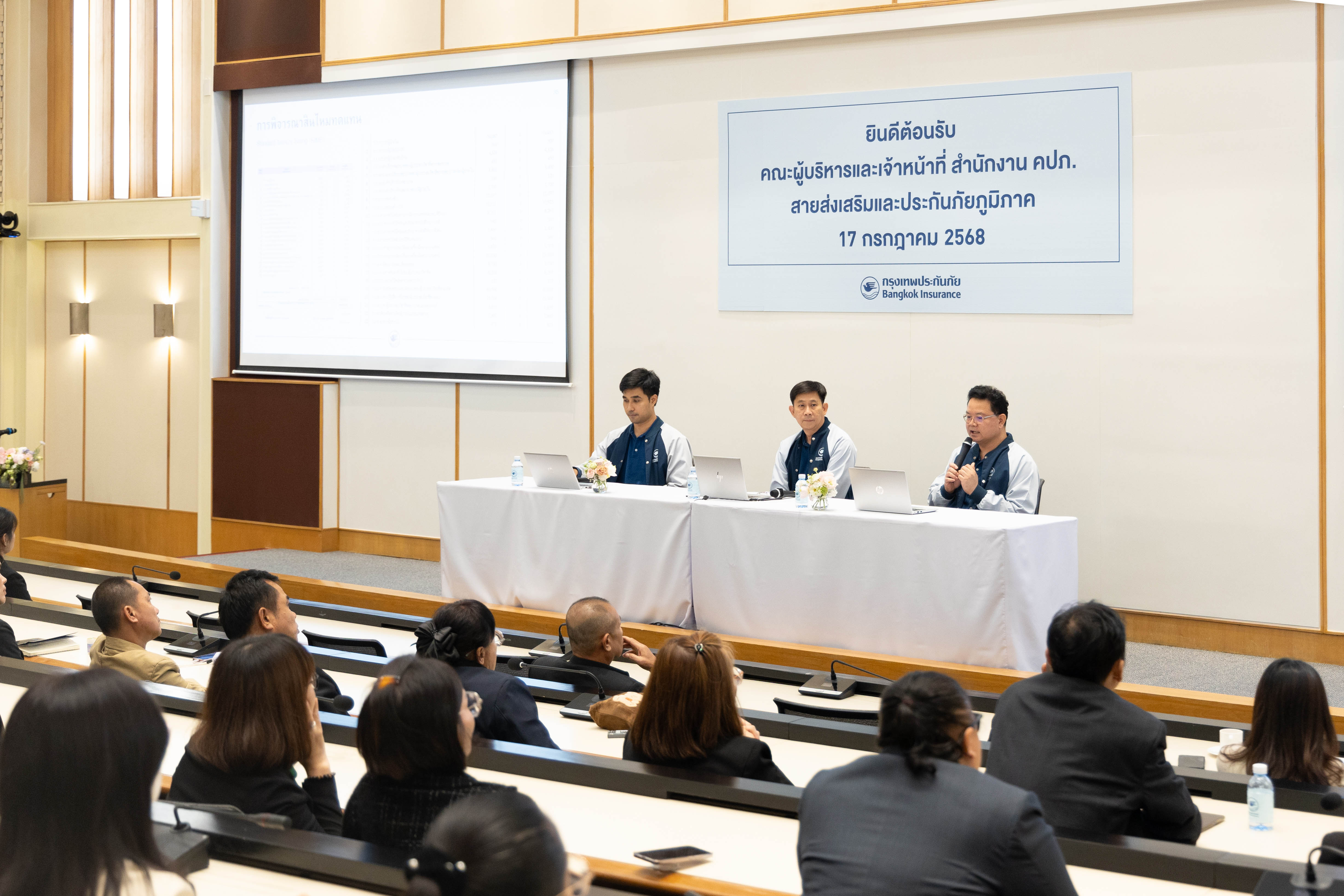 22 กรกฎาคม 2568 : ดร.อภิสิทธิ์ อนันตนาถรัตน กรรมการและประธานคณะผู้บริหาร บริษัท กรุงเทพประกันภัย จำกัด (มหาชน) และคณะผู้บริหารให้การต้อนรับ วสุมดี วสีนนท์ รองเลขาธิการ ด้านกำกับคนกลางและประกันภัยภูมิภาค วิไลรัตน์ แสงแก้ว ผู้ช่วยเลขาธิการ สายส่งเสริมและประกันภัยภูมิภาค พร้อมด้วยคณะผู้บริหารและเจ้าหน้าที่สายส่งเสริมและประกันภัยภูมิภาค สำนักงานคณะกรรมการกำกับและส่งเสริมการประกอบธุรกิจประกันภัย หรือสำนักงาน คปภ. จำนวนกว่า 70 คน ในโอกาสที่ให้ความสนใจเข้าเยี่ยมชมดูงาน ณ อาคารกรุงเทพประกันภัย ถนนสาทรใต้ เมื่อวันที่ 17 กรกฎาคม 2568