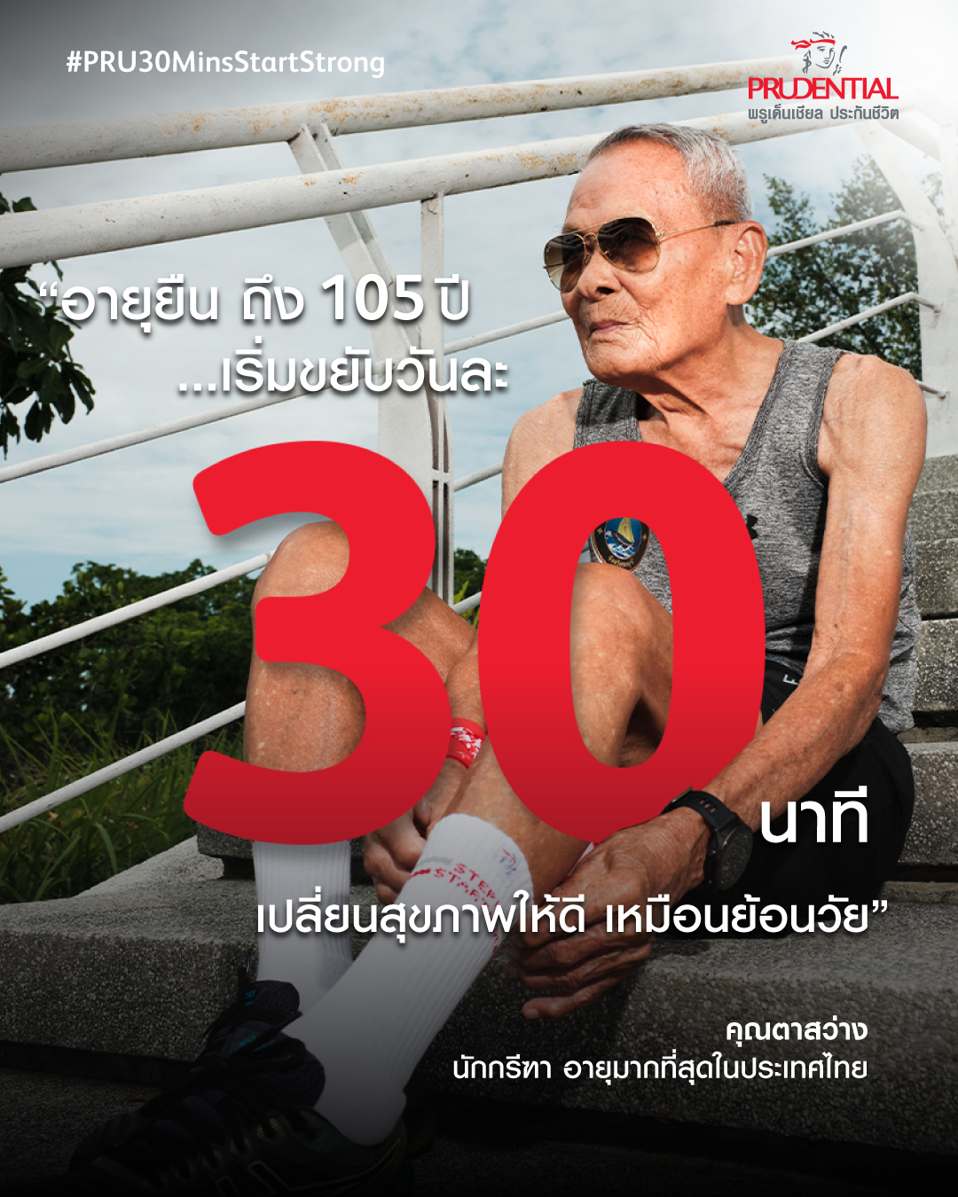 สำหรับแคมเปญ #PRU30MinsStartStrong ยังได้รับการถ่ายทอดเรื่องราวจากเหล่า “PRUHeros” ที่พร้อมส่งต่อแรงบันดาลใจผ่าน Youtube ของ Prudential Thailand “4 เรื่องจริง กับ 30 นาทีเปลี่ยนชีวิต” (https://www.youtube.com/watch?v=3VJFiGiUoS0 ) หนึ่งในนั้นคือเรื่องราวของ คุณตาสว่าง จันทร์พราหมณ์ นักกรีฑาวัย 105 ปี ที่เริ่มต้นออกกำลังกายเมื่ออายุเกือบ 100 ปี ด้วยความตั้งใจที่จะไม่เป็นเพียงผู้เฝ้าดูชีวิต แต่ขอ “มีชีวิต” เพื่อสิ่งที่รักและคนที่รัก คุณตาสว่าง เริ่มต้นด้วยการออกกำลังกายวันละ 30 นาทีอย่างสม่ำเสมอ จนสามารถคว้า 3 เหรียญทอง รวมถึงสร้างสถิติเป็นนักกีฬาไทยที่มีอายุมากที่สุดที่ได้รับเหรียญทอง จากการแข่งขันมหกรรมกีฬาสูงอายุโลก เวิลด์ มาสเตอร์ เกมส์ 2025 ที่ไต้หวัน ด้วยความเชื่อว่า “ผมไม่อยากเป็นแค่คนดูชีวิตของตัวเอง ผมอยากมีชีวิตอยู่เพื่อสิ่งที่รักและคนที่รัก การออกกำลังกายวันละ 30 นาที ทำให้ผมแข็งแรง มีพลัง และมีความสุขทุกวัน”