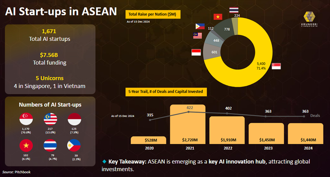 ในระดับภูมิภาค Krungsri Finnovate มองว่าเอเชียตะวันออกเฉียงใต้กำลังก้าวขึ้นเป็นจุดหมายใหม่ของนักลงทุนเทคโนโลยีทั่วโลก โดยปัจจุบันภูมิภาคนี้มีสตาร์ทอัพด้าน AI รวมกว่า 1,671 ราย ด้วยมูลค่าการลงทุนสะสมถึง 7.56 พันล้านดอลลาร์ ภาพรวมนี้สะท้อนถึงโอกาสอันมหาศาลในการเติบโตของเศรษฐกิจนวัตกรรมในอนาคตอันใกล้