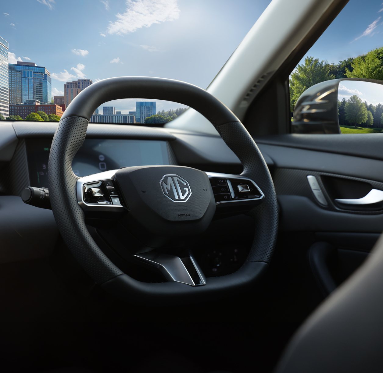NEW MG S5 EV D+ ห้องโดยสารกว้างใหญ่สัมภาระด้านท้ายจุของได้เยอะ พร้อมการตบแต่งที่เน้นความเรียบง่าย พร้อมพวงมาลัยมัลติฟังก์ชันหุ้มหนังแท้ ปรับได้ 4 ทิศทาง มอบสัมผัสที่นุ่มนวลพร้อมปุ่มควบคุมเครื่องเสียงและโทรศัพท์ที่ปลายนิ้ว เพื่อให้ทุกการขับขี่เต็มไปด้วยความสะดวกสบาย ผสานความทันสมัยของเทคโนโลยีที่ตอบโจทย์ไลฟ์สไตล์ของครอบครัวยุคใหม่