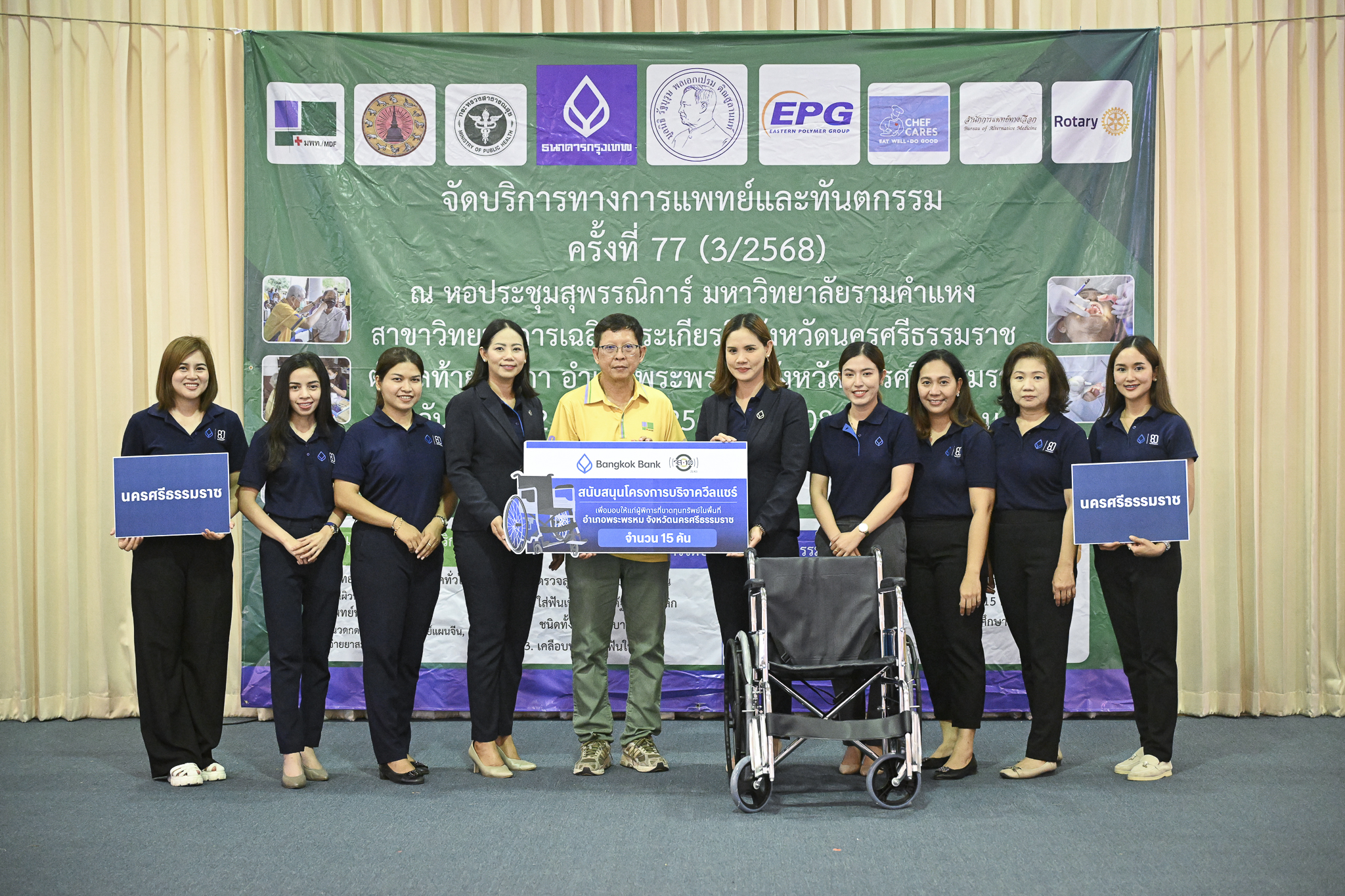 13 สิงหาคม 2568 : ธนาคารกรุงเทพ จำกัด (มหาชน) นำโดย ชลมาศ ทองชัย ผู้จัดการสาขานครศรีธรรมราช พร้อมผู้จัดการสาขา และพนักงานในภาคใต้ 1 สายลูกค้าบุคคล ลงพื้นที่เป็นอาสาสมัคร ร่วมกับทีมแพทย์ เภสัชกร พยาบาล มอบเงินสนับสนุนจำนวน 100,000 บาท รถเข็นวีลแชร์ จำนวน 15 คัน แว่นสายตายาว จำนวน 800 อัน เพื่อสนับสนุนการจัดกิจกรรมออกหน่วยแพทย์ และทันตแพทย์เคลื่อนที่ ครั้งที่ 77 (ครั้งที่ 3 ของปี 2568) ของมูลนิธิหน่วยแพทย์ และทันตแพทย์เคลื่อนที่ (มพท.)