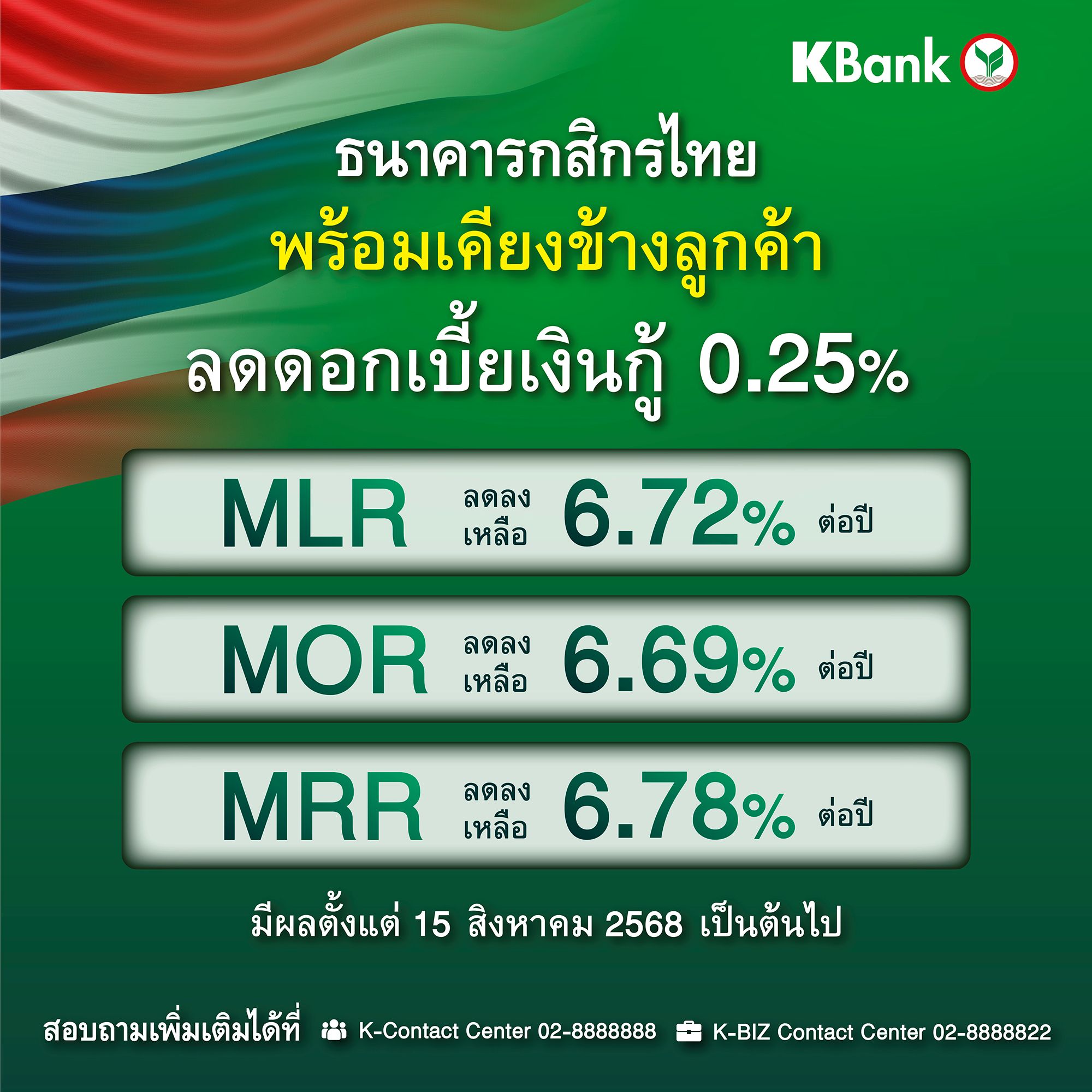 14 สิงหาคม 2568 : นายจงรัก รัตนเพียร ผู้จัดการใหญ่ ธนาคารกสิกรไทย เปิดเผยว่าการปรับลดอัตราดอกเบี้ยในครั้งนี้สอดคล้องกับมติของคณะกรรมการนโยบายการเงิน (กนง.) ซึ่งได้มีมติเป็นเอกฉันท์ในการประชุมเมื่อวันที่ 13 สิงหาคม 2568 ให้ลดอัตราดอกเบี้ยนโยบายลงร้อยละ 0.25 เหลือร้อยละ 1.50 ต่อปี ตามภาวะเศรษฐกิจไทยที่แม้จะยังคงขยายตัวได้ใกล้เคียงกับที่ประเมินไว้ แต่ยังเผชิญความท้าทายหลายด้านซึ่งมีแนวโน้มจะส่งผลกระทบต่อปัญหาเชิงโครงสร้างและขีดความสามารถในการแข่งขันของประเทศ