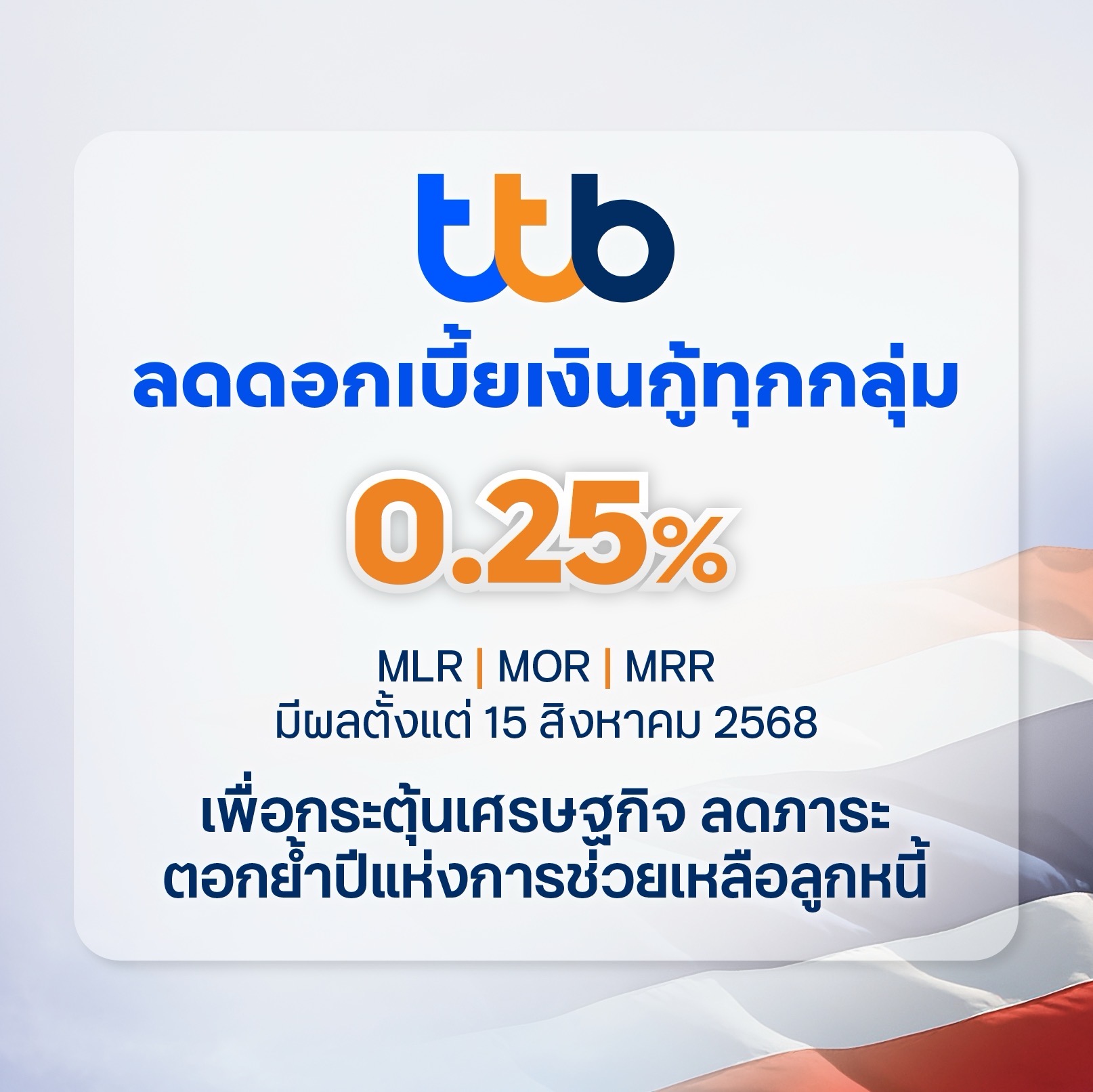15 สิงหาคม 2568 : นายปิติ ตัณฑเกษม ประธานเจ้าหน้าที่บริหาร ทีเอ็มบีธนชาต กล่าวว่า ทีทีบี พร้อมอยู่เคียงข้างและให้การสนับสนุนทางการเงินแก่ลูกค้าทุกกลุ่มในทุกสถานการณ์มาโดยตลอด โดยเฉพาะในช่วงนี้ที่สภาพเศรษฐกิจเปราะบางจากปัจจัยภายในและนอกประเทศ อาทิ ความเสี่ยงที่เพิ่มขึ้นจากมาตรการภาษีสหรัฐในช่วงครึ่งปีหลังที่กระทบต่อความสามารถในการแข่งขันของภาคธุรกิจ ผลพวงจากจำนวนนักท่องเที่ยวต่างชาติที่มีแนวโน้มลดลง อีกทั้งปัญหาหนี้ครัวเรือนที่รายได้ไม่สัมพันธ์กับรายจ่ายยังคงเป็นปัญหาเรื้อรัง ล้วนเป็นปัจจัยที่กดดันให้เศรษฐกิจไทยมีแนวโน้มปรับตัวลง เพื่อเป็นการสอดรับกับมติ กนง. ที่ต้องการช่วยเพิ่มความผ่อนคลาย กระตุ้นการฟื้นตัวของเศรษฐกิจ และช่วยบรรเทาไม่ให้ค่าครองชีพของลูกค้าและต้นทุนของธุรกิจยิ่งสูงไปกว่านี้ ทีทีบี จึงได้พิจารณาปรับลดอัตราดอกเบี้ยเงินกู้ลง 0.25% ต่อปีเพื่อช่วยเหลือลูกค้าทุกกลุ่ม ตั้งแต่รายย่อย ผู้ประกอบการเอสเอ็มอี และกลุ่มลูกค้าธุรกิจ สำหรับผลิตภัณฑ์สินเชื่อที่อ้างอิงอัตราดอกเบี้ย MLR, MOR และ MRR โดยมีผลตั้งแต่วันที่ 15 ส.ค. 2568