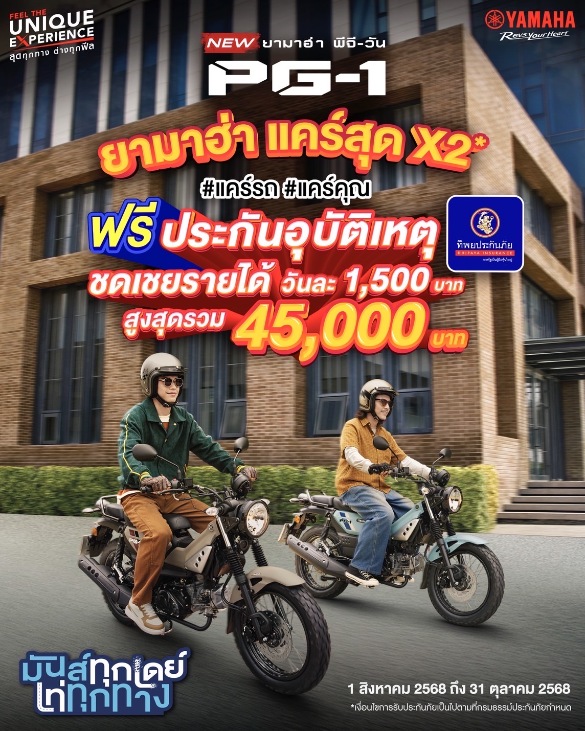 เพียงซื้อ New YAMAHA PG-1 ตั้งแต่วันที่ 1 สิงหาคม – 31 ตุลาคม 2568 รับสิทธิ์ทันที! ประกันอุบัติเหตุชดเชยรายได้ระหว่างพักรักษาตัวในโรงพยาบาล วันละ 1,500 บาท (สูงสุด 3 วันต่ออุบัติเหตุ และไม่เกิน 10 ครั้งต่อปี) รวมความคุ้มครองสูงสุดกว่า 45,000 บาท