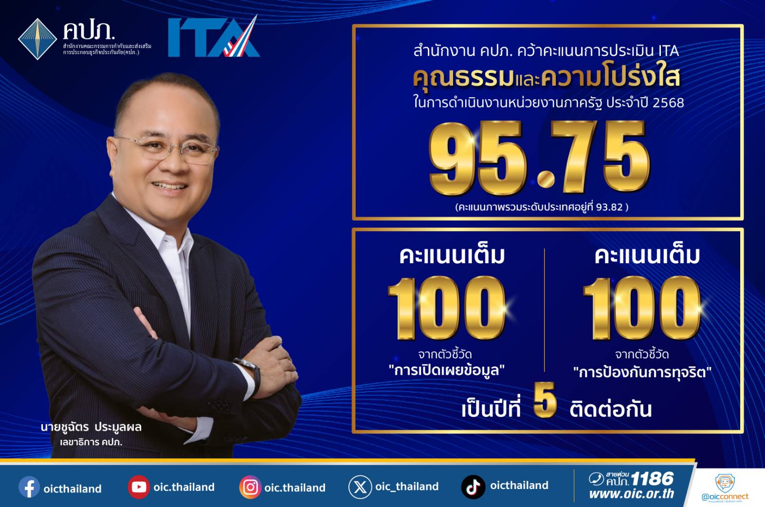 โดยปีนี้มีหน่วยงานภาครัฐเข้าร่วมการประเมินทั้งสิ้น 8,327 หน่วยงาน คะแนนภาพรวมระดับประเทศอยู่ที่ 93.82 คะแนน สำหรับสำนักงาน คปภ. ได้คะแนน 95.75 อยู่ในระดับ “ผ่าน” และได้รับ 100 คะแนนเต็มในตัวชี้วัด “การเปิดเผยข้อมูล” และ “การป้องกันการทุจริต” การประเมินคุณธรรมและความโปร่งใสในการดำเนินงานของหน่วยงานภาครัฐ (Integrity and Transparency Assessment) หรือ “การประเมิน ITA” เป็นเครื่องมือสำคัญที่สำนักงาน ป.ป.ช. ใช้ในการยกระดับมาตรฐานการดำเนินงานภาครัฐตามตัวชี้วัดของแผนแม่บทภายใต้ยุทธศาสตร์ชาติ ประเด็นการต่อต้านการทุจริตและประพฤติมิชอบ (พ.ศ. 2561 - 2580)