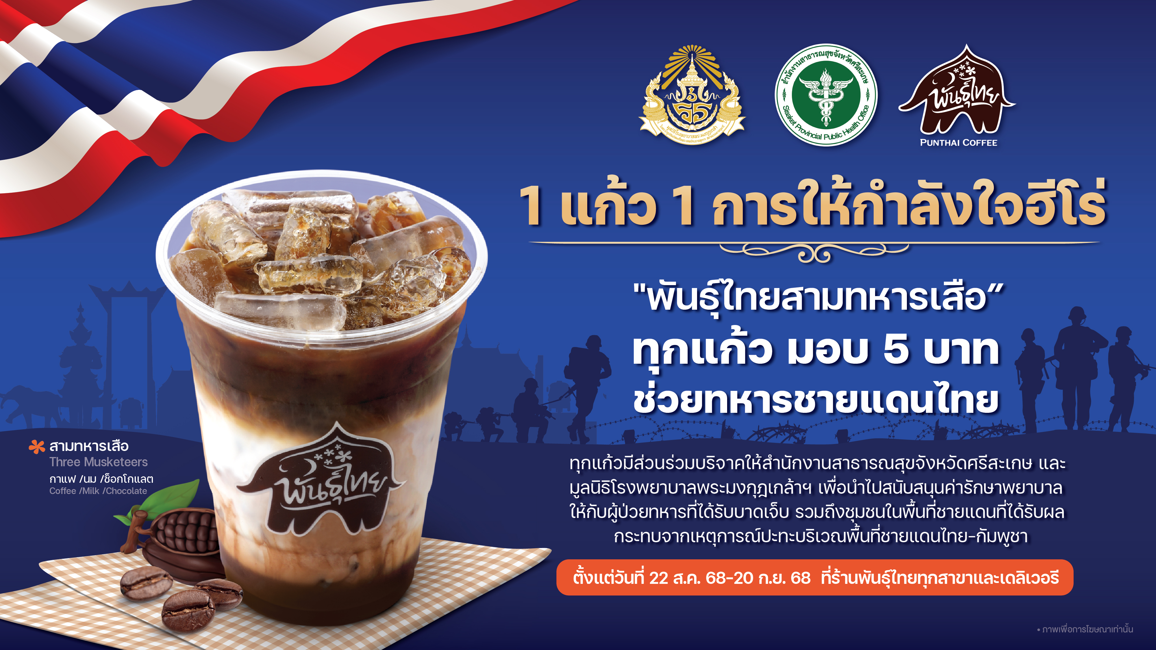 22 สิงหาคม 2568 : กาแฟพันธุ์ไทยร่วมสนับสนุนทหารแนวรบชายแดนผู้เสียสละ กับโครงการ “1 แก้ว 1 การให้กำลังใจฮีโร่” โดยทุกการสั่งซื้อเมนู ‘สามทหารเสือ’ 1 แก้ว ลูกค้าจะมีส่วนร่วมในการบริจาคเงิน 5 บาท ให้แก่สำนักงานสาธารณสุขจังหวัดศรีสะเกษ และ โรงพยาบาลพระมงกุฎเกล้าในพระราชูปถัมภ์ สมเด็จพระเทพรัตนราชสุดาฯ สยามบรมราชกุมารี เพื่อนำไปสนับสนุนค่ารักษาพยาบาล จัดหาอุปกรณ์ทางการแพทย์ เวชภัณฑ์ และเครื่องมือแพทย์ที่จำเป็นและทันสมัย พร้อมเพิ่มประสิทธิภาพการรักษาให้กับผู้ป่วยทหารที่ได้รับบาดเจ็บจากการปฏิบัติหน้าที่ในเหตุปะทะบริเวณพื้นที่ชายแดนไทย – กัมพูชา ตั้งแต่วันที่ 22 สิงหาคม 2568 – 20 กันยายน 2568 ที่ร้านกาแฟพันธุ์ไทยทุกสาขาที่ร่วมรายการ และ บริการเดลิเวอรีจัดส่งถึงบ้าน