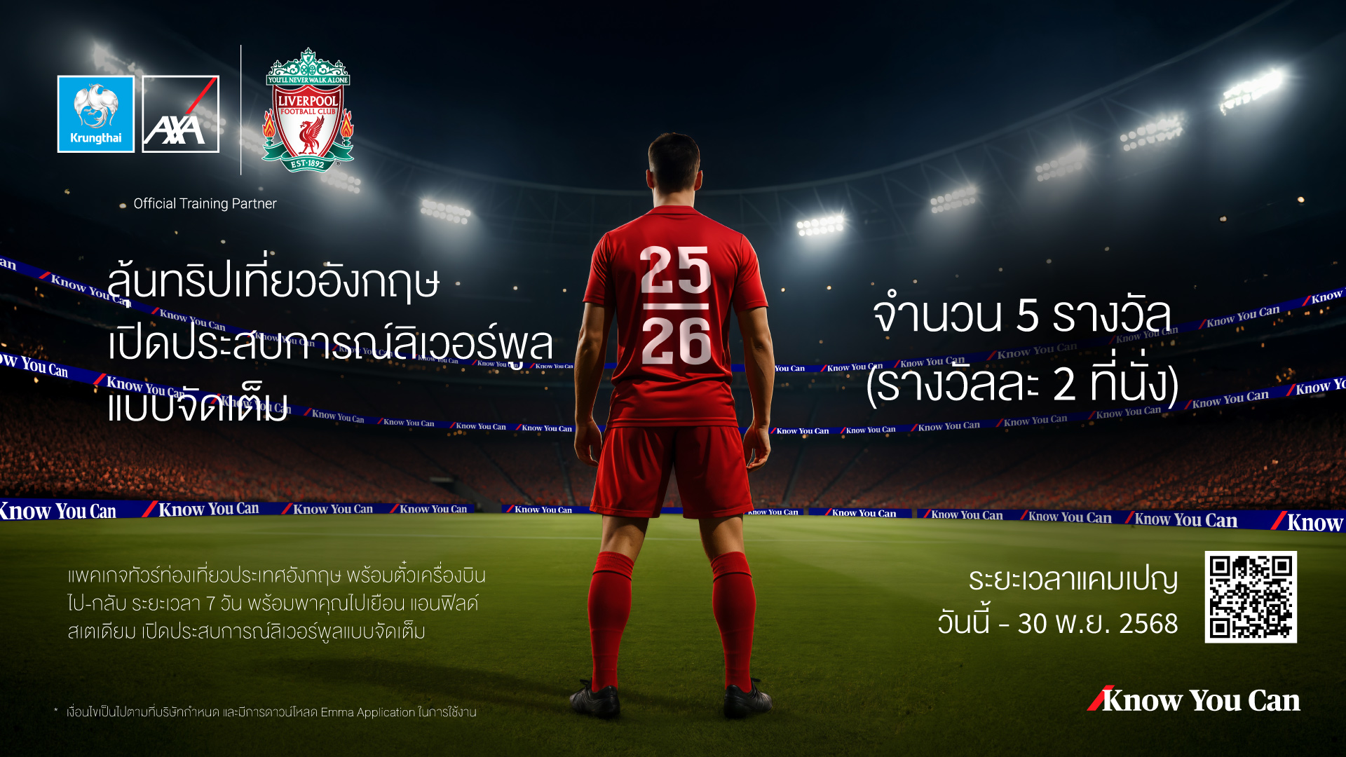 26 สิงหาคม 2568 : บมจ.กรุงไทย-แอกซ่า ประกันชีวิต จัดแคมเปญ ‘ลุ้นทริปเที่ยวอังกฤษ เปิดประสบการณ์ลิเวอร์พูลแบบจัดเต็ม กับ กรุงไทย-แอกซ่า ประกันชีวิต’ ประจำปี 2568 ให้แก่ลูกค้าที่ซื้อผลิตภัณฑ์ภายใต้เงื่อนไขแคมเปญของ กรุงไทย-แอกซ่า ประกันชีวิต ตั้งแต่วันนี้ – 30 พฤศจิกายน 2568 ทั้งนี้บริษัทฯ จะจับรางวัลผู้โชคดีทั้งหมด จำนวน 5 รางวัล (รางวัลละ 2 ที่นั่ง) มูลค่ารางวัลละ 450,000 บาท โดยผู้โชคดีจะได้รับแพคเกจท่องเที่ยวที่ประเทศอังกฤษ พร้อมรับชมฟุตบอลทีมลิเวอร์พูล ณ แอนฟิลด์ สเตเดียม เมืองลิเวอร์พูล ซึ่งทางบริษัทฯ จะประกาศรายชื่อผู้โชคดีในวันพุธที่ 14 มกราคม 2569 ผ่านเว็บไซต์ของกรุงไทย-แอกซ่า ประกันชีวิต