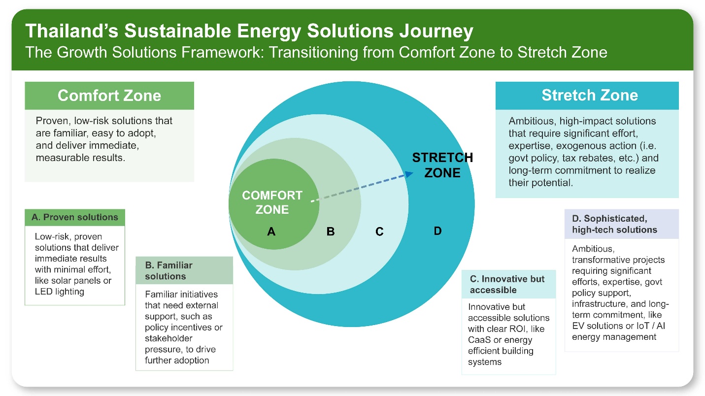 - “Comfort Zone” คือ การใช้โซลูชันพลังงานที่ได้รับการยอมรับโดยทั่วไป มีความเสี่ยงต่ำ และมอบผลลัพธ์ที่เป็นประจักษ์ในทันที หรือมอบผลลัพธ์ในระยะสั้นเท่านั้น