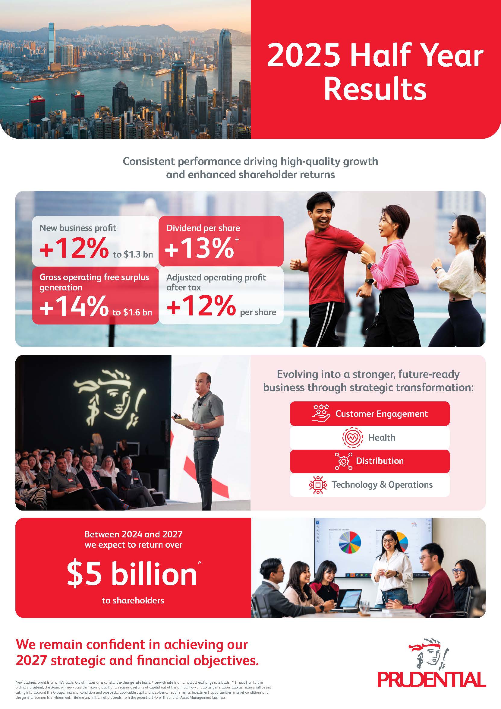 27 สิงหาคม 2568 : กลุ่มบริษัทพรูเด็นเชียล แถลงผลการดำเนินงานครึ่งปีแรก (สิ้นสุดวันที่ 30 มิ.ย. 68) รวมทั้งนำเสนอความคืบหน้าของแผนส่งมอบคุณค่าแก่ผู้ถือหุ้นอย่างต่อเนื่อง ภายใต้โครงการซื้อหุ้นคืนของบริษัทฯ สำหรับผลการดำเนินงานที่โดดเด่นในช่วงครึ่งปีแรกนั้น พรูเด็นเชียล มีผลกำไรธุรกิจใหม่ (New Business Profit) เติบโตเพิ่มขึ้น 12% เมื่อเทียบกับปีที่แล้ว อยู่ที่ 1,260 ล้านดอลลาร์สหรัฐ (ตามวิธีการคำนวณแบบ Traditional Embedded Value -TEV) บริษัทฯ มีกระแสเงินสดส่วนเกินจากธุรกิจประกันชีวิตที่ยังมีผลบังคับ และธุรกิจการจัดการสินทรัพย์ เพิ่มขึ้น 14% คิดเป็นมูลค่า 1,560 ล้านดอลลาร์สหรัฐ