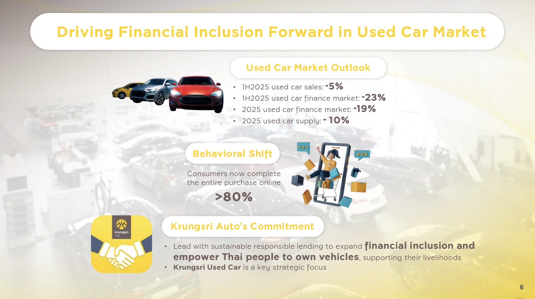 ทั้งนี้ ในช่วงครึ่งปีหลัง 2568 กรุงศรี ออโต้ มุ่งมั่นที่จะเป็นส่วนหนึ่งในการช่วยพลิกฟื้นตลาดรถยนต์มือสอง เนื่องจากในครึ่งปีแรกที่ผ่านมา ยอดขายรถยนต์มือสองลดลงจากช่วงเวลาเดียวกันของปีก่อนหน้าราว 5% โดยมีสาเหตุหลักมาจากสถานการณ์ทางเศรษฐกิจ และความเชื่อมั่นของผู้บริโภคที่ปรับตัวลดลงอย่างต่อเนื่อง แต่มาช่วงครึ่งปีหลังเริ่มมีสัญญาณของการซื้อรถยนต์มือสองเพิ่มมากขึ้น โดยเฉพาะรถน้ำมันและรถไฮบริด ส่วนรถไฟฟ้านั้นดีเลอร์ยังไม่มั่นใจที่จะนำเข้ามาขายเนื่องจากประเด็นเรื่องการตั้งราคาขาย