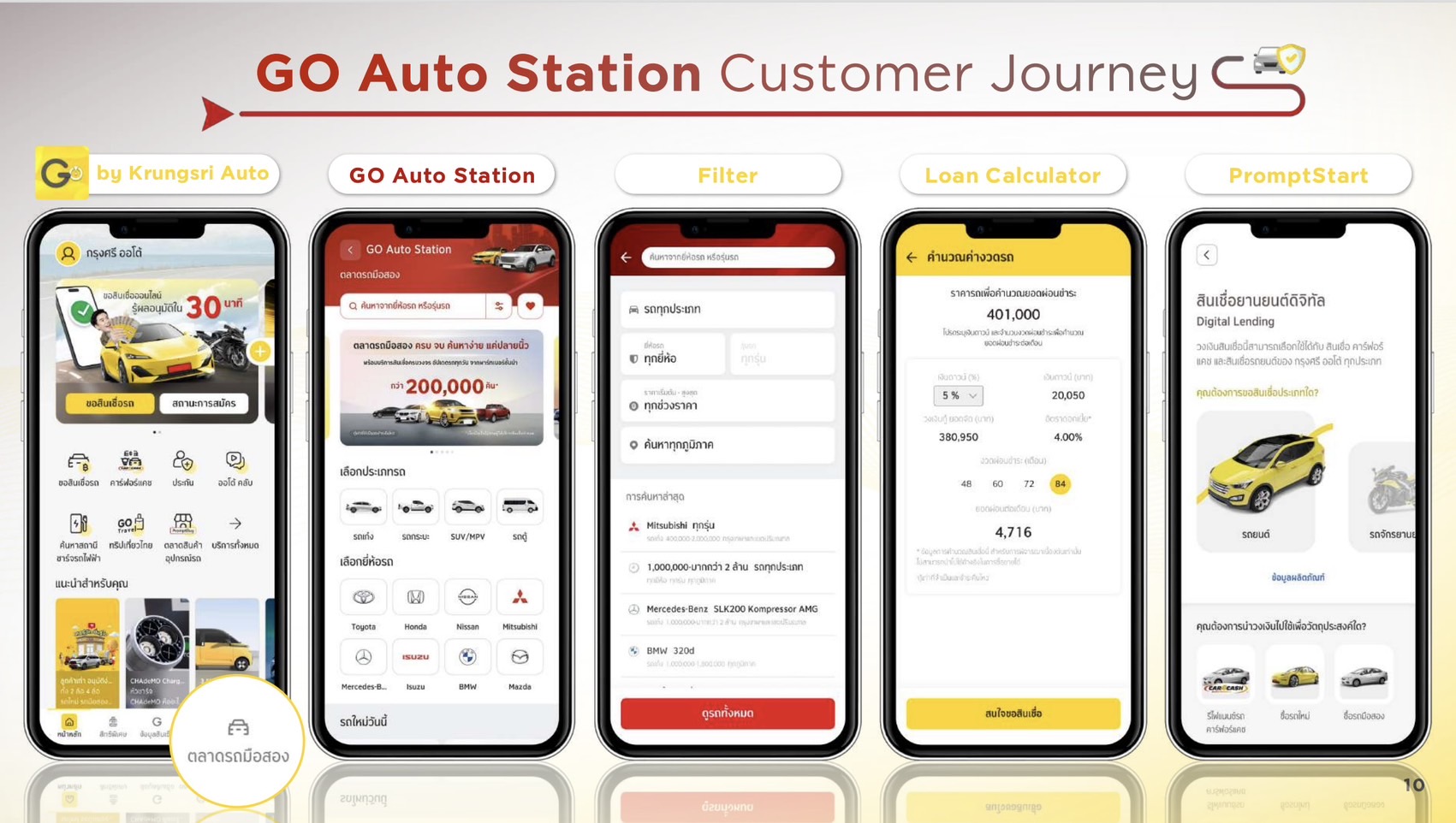 สะดวก ด้วยระบบการค้นหาข้อมูลรถที่ครบถ้วน ฟังก์ชันตัวกรองที่หลากหลาย และการเปรียบเทียบข้อเสนอต่าง ๆ ได้อย่างแม่นยำ พร้อมรองรับพฤติกรรมผู้ใช้รถยุคใหม่ที่นิยมซื้อรถมือสองผ่านช่องทางออนไลน์เป็นหลักรวดเร็ว เช็กวงเงินหรือขอสินเชื่อยานยนต์จากนวัตกรรม ‘พร้อมสตาร์ท’ ผ่าน ‘GO Auto Station ตลาดรถมือสอง’ จากกรุงศรี ยูสด์ คาร์ (Krungsri Used Car) บนแอป โก บาย กรุงศรี ออโต้ คำนวณค่างวด และรับการอนุมัติสินเชื่อได้ภายใน 30 นาที ครบทุกขั้นตอนแบบดิจิทัลครบจบ ด้วยการเป็นแหล่งซื้อขายรถยนต์มือสองที่มีจำนวนรถหมุนเวียนมากที่สุดในตลาดกว่า 218,000 คัน ซึ่งผ่านการคัดสรรมาจากอีโคซิสเต็มของกรุงศรี ออโต้ ทั่วประเทศ โดยมีรถที่ผ่านการตรวจสภาพและจัดเกรดรถยนต์ (Car Grading) จากพันธมิตรมืออาชีพ พร้อมยังเชื่อมต่อกับบริการสินเชื่อ ประกันภัย การดูแลรักษารถ ไปจนถึงบริการสำหรับลูกค้าปัจจุบัน เช่น การชำระค่างวดรถ ต่อ พ.ร.บ. และสิทธิพิเศษด้านไลฟ์สไตล์ผู้ใช้รถ เพื่อสร้างประสบการณ์ที่ครบวงจรในแอปเดียว