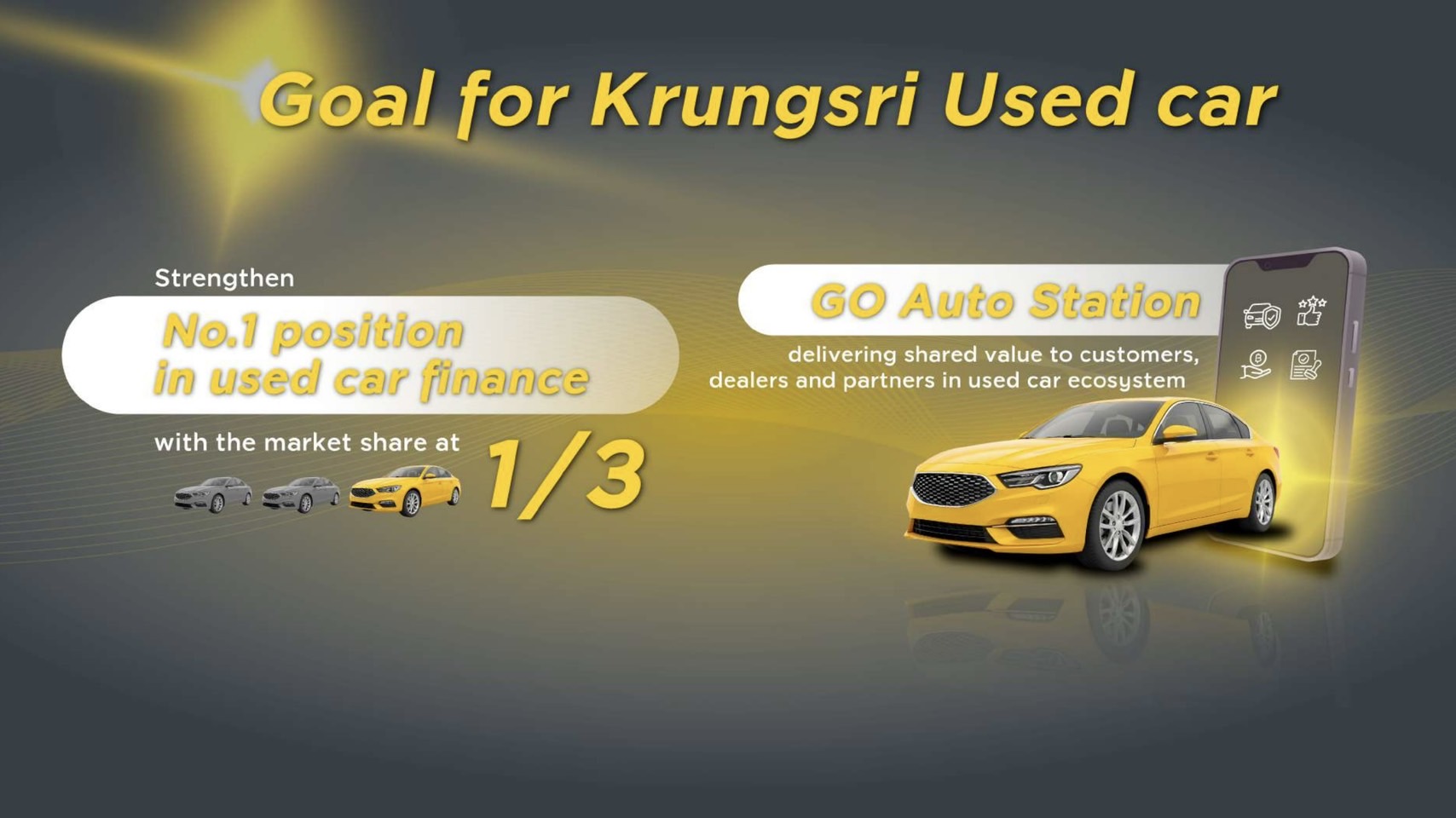 “กรุงศรี ออโต้ ครองตำแหน่งผู้นำตลาดสินเชื่อรถยนต์มือสองมาอย่างยาวนาน ด้วยส่วนแบ่งการตลาดในปัจจุบันมากถึง 1 ใน 3 ของสินเชื่อรถยนต์มือสองทั้งหมดในประเทศไทย ซึ่งในฐานะผู้กำหนดทิศทางตลาด (Market Shaper) กรุงศรี ออโต้ พร้อมที่จะเข้ามาสร้างมาตรฐานใหม่ให้กับอุตสาหกรรม ผ่าน ‘GO Auto Station ตลาดรถมือสอง’ ซึ่งเป็นแหล่งซื้อขายรถยนต์มือสองในรูปแบบ One-Stop Solution แห่งแรกของประเทศไทย ที่เชื่อมต่อผู้ซื้อ ผู้ขาย และผู้ให้บริการสินเชื่อไว้ในที่เดียว ซึ่งจะทำให้ลูกค้าได้รับความสะดวก รวดเร็ว และได้เลือกซื้อรถยนต์มือสองที่มีคุณภาพ ขณะที่พันธมิตรดีลเลอร์จะมีโอกาสในการเข้าถึงลูกค้าที่มีศักยภาพมากยิ่งขึ้น ซึ่งทั้งหมดนี้จะส่งผลให้ตลาดรถยนต์มือสองและเศรษฐกิจไทยเติบโตไปข้างหน้าต่อไป” นายคงสิน กล่าวเพิ่มเติม
