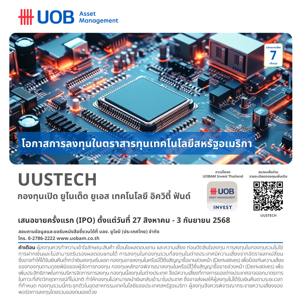28 สิงหาคม 2568 : นางสาวรัชดา ตั้งหะรัฐ รองประธานเจ้าหน้าที่บริหาร บลจ.ยูโอบี เปิดเผยว่า บลจ.ยูโอบี เล็งเห็นให้นักลงทุนสามารถลงทุนเพื่อการเติบโตของเงินทุนในระยะยาว โดยเน้นการลงทุนในบริษัทที่เกี่ยวข้องกับธุรกิจเทคโนโลยีในประเทศสหรัฐอเมริกาจึงร่วมมือกับพันธมิตรที่มีความเชี่ยวชาญในระดับสากลคือ J.P. Morgan Asset Management (Europe) S.à r.l นำเสนอ กองทุนเปิด ยูไนเต็ด ยูเอส เทคโนโลยี อิควิตี้ ฟันด์ (UUSTECH) เพื่อเปิดโอกาสให้นักลงทุนที่มองหาการลงทุนในตราสารทุนเทคโนโลยีสหรัฐฯ สำหรับสร้างการเติบโตของเงินทุนในระยะยาว เสนอขายครั้งแรกระหว่างวันที่ 27 สิงหาคม – 3 กันยายน 2568