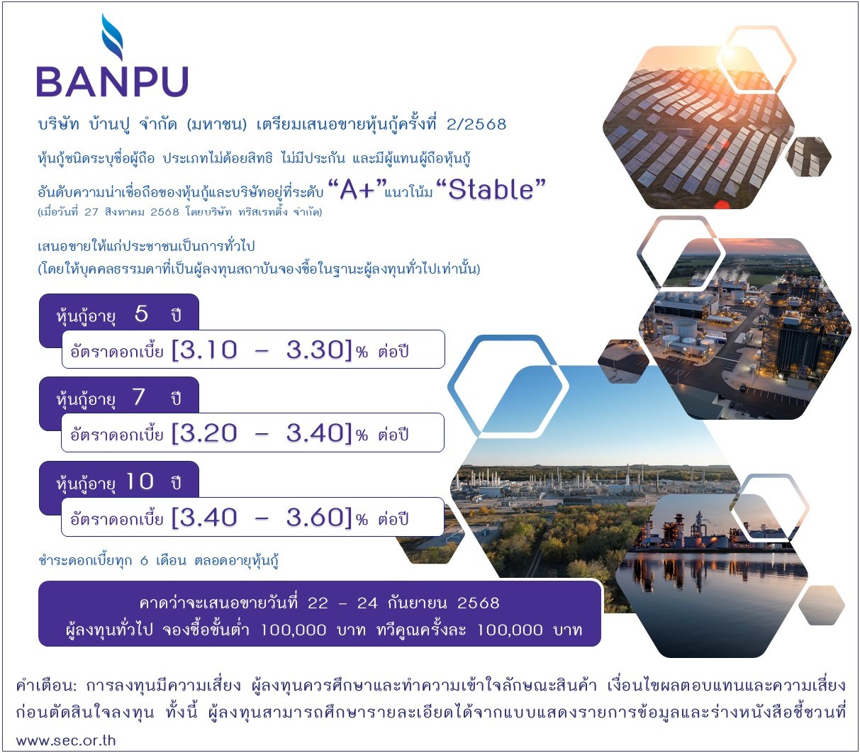 28 สิงหาคม 2568 : บริษัท บ้านปู จำกัด (มหาชน) ผู้นำด้านพลังงานที่หลากหลาย เตรียมออกและเสนอขายหุ้นกู้ให้แก่ประชาชนเป็นการทั่วไป (Public Offering) จำนวน 3 ชุด ผ่าน 7 สถาบันการเงินชั้นนำ โดยหุ้นกู้ได้รับการจัดอันดับเครดิตจากทริสเรทติ้งที่ระดับ “A+” แนวโน้ม “คงที่” เมื่อวันที่ 27 สิงหาคม พ.ศ. 2568