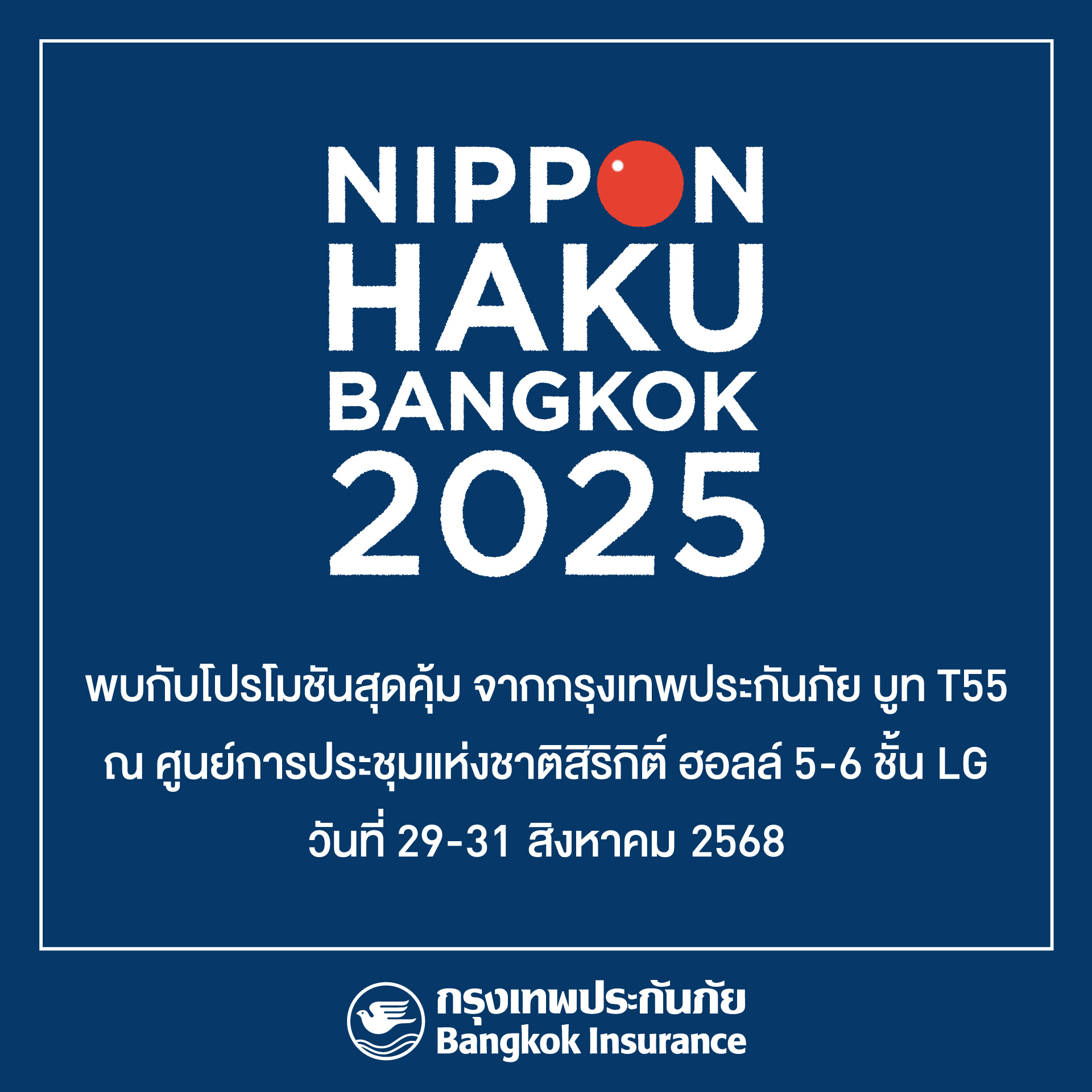 29 สิงหาคม 2568 : บริษัท กรุงเทพประกันภัย จำกัด (มหาชน) ร่วมออกบูทในงาน Nippon Haku Bangkok 2025 งานมหกรรมญี่ปุ่นที่ใหญ่ที่สุดในไทย ภายใต้แนวคิด ยิ่งรู้จัก ยิ่งรักญี่ปุ่น ระหว่างวันที่ 29-31 สิงหาคม 2568 ณ ศูนย์การประชุมแห่งชาติสิริกิติ์ ฮอลล์ 5-6 ชั้น LG ในงานนี้ บริษัทฯ ได้จัดเต็มโปรโมชันสุดพิเศษสำหรับผู้ที่มองหาความอุ่นใจในการเดินทางไม่ว่าจะเพื่อการท่องเที่ยวหรือเพื่อการศึกษาในต่างประเทศ รวมถึงประกันภัยประเภทอื่นๆ เช่น ประกันภัยรถยนต์ ประกันอัคคีภัย ประกันภัยอุบัติเหตุส่วนบุคคล ประกันภัยสุขภาพ ประกันภัยโรคมะเร็ง ฯลฯ ที่ให้ความคุ้มครองรองรับไลฟ์สไตล์ของลูกค้า โดยมีทีมงานรับประกันภัยพร้อมบริการให้คำปรึกษา และคำแนะนำเกี่ยวกับแผนประกันภัยที่เหมาะสมกับความคุ้มครองที่หลากหลาย