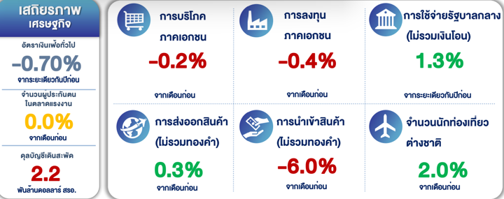 เสถียรภาพเศรษฐกิจ อัตราเงินเฟ้อทั่วไปติดลบมากขึ้นจากเดือนก่อน จากอัตราเงินเฟ้อหมวดอาหารสดตามราคาผลไม้และเนื้อสัตว์ที่ลดลง และอัตราเงินเฟ้อหมวดพลังงานตามราคาน้ำมันขายปลีกในประเทศ สอดคล้องกับราคาน้ำมันในตลาดโลกประกอบกับอัตราเงินเฟ้อพื้นฐานชะลอลงจากราคาอาหารสำเร็จรูปที่ฐานสูงในปีก่อนและราคาของใช้ส่วนตัวที่ปรับลดลงจากการทำโปรโมชัน สำหรับดุลบัญชีเดินสะพัดเกินดุลลดลงเล็กน้อยตามดุลการค้าที่ลดลงเป็นสำคัญ ด้านการจ้างงานโดยรวมทรงตัวจากเดือนก่อน แต่ยังต้องติดตามแนวโน้มการจ้างงานในระยะข้างหน้า และสัดส่วนผู้ขอรับสิทธิว่างงานต่อผู้ประกันตนที่เพิ่มขึ้น