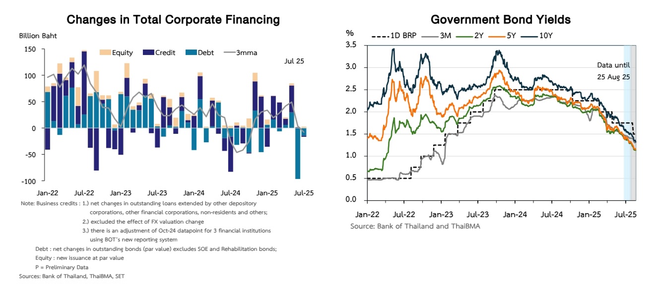 ภาวะการเงินและเสถียรภาพภาวะการเงิน การระดมทุนของภาคธุรกิจโดยรวมปรับลดลงจากช่องทางตลาดตราสารหนี้และสินเชื่อ โดยการระดมทุนผ่านตลาดตราสารหนี้ปรับลดลงในเกือบทุกสาขาโดยเฉพาะสาขาเทคโนโลยีสารสนเทศ อสังหาริมทรัพย์ และพลังงาน โดยเป็นผลจากปริมาณการออกหุ้นกู้ใหม่ที่ต่ำกว่าปริมาณหุ้นกู้ที่ครบกำหนด ทั้งนี้ การออกหุ้นกู้ใหม่ส่วนใหญ่มีวัตถุประสงค์เพื่อทดแทนหุ้นกู้ที่ครบกำหนด (rollover) ด้านการระดมทุนผ่านสินเชื่อสุทธิลดลงเล็กน้อยในสาขาธุรกิจการผลิตในสาขาเคมีภัณฑ์ วัสดุก่อสร้าง อาหารและเครื่องดื่ม และปิโตรเลียม อย่างไรก็ดี การระดมทุนผ่านตลาดทุน เพิ่มขึ้นเล็กน้อยจากการขายหุ้นเพิ่มทุนของธุรกิจในภาคบริการ โดยเฉพาะธุรกิจให้บริการโฆษณาเป็นสำคัญ สำหรับต้นทุนการระดมทุนผ่านตราสารหนี้ ตั้งแต่ 1 ก.ค. ถึง 25 ส.ค. อัตราผลตอบแทนพันธบัตรรัฐบาลไทยทั้งระยะสั้นและระยะยาวเฉลี่ยปรับลดลงตามการคาดการณ์อัตราดอกเบี้ยนโยบายของไทย จากตัวเลขผลิตภัณฑ์มวลรวมภายในประเทศ (GDP) และเงินเฟ้อของไทยที่อยู่ในระดับต่ำ