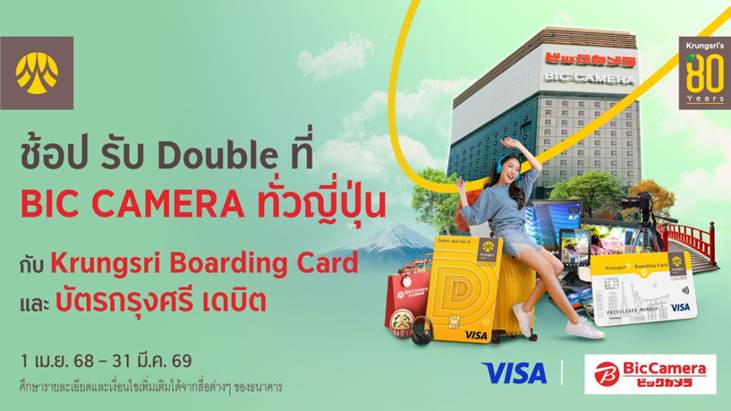 1 กันยายน 2568 : กรุงศรี (ธนาคารกรุงศรีอยุธยา จำกัด (มหาชน)) ให้คุณช้อปได้แบบจุใจที่ BIC CAMERA 49 สาขาทั่วญี่ปุ่น เมื่อใช้จ่ายผ่านบัตร Krungsri Boarding Card และบัตรกรุงศรี เดบิต ทุกประเภท รับการยกเว้นภาษีส่วนลดสูงสุด 10% เพียงแจ้งพนักงานและทำตามขั้นตอนที่กำหนด และรับส่วนลดเพิ่ม 5% เมื่อซื้อสินค้าปลอดภาษี ตั้งแต่ 5,264 เยนขึ้นไป (ไม่รวมภาษี) แสดงหนังสือเดินทาง ณ เคาน์เตอร์ชำระเงินของร้านค้าที่ร่วมรายการ ตั้งแต่วันที่ 1 เมษายน 2568 – 31 มีนาคม 2569