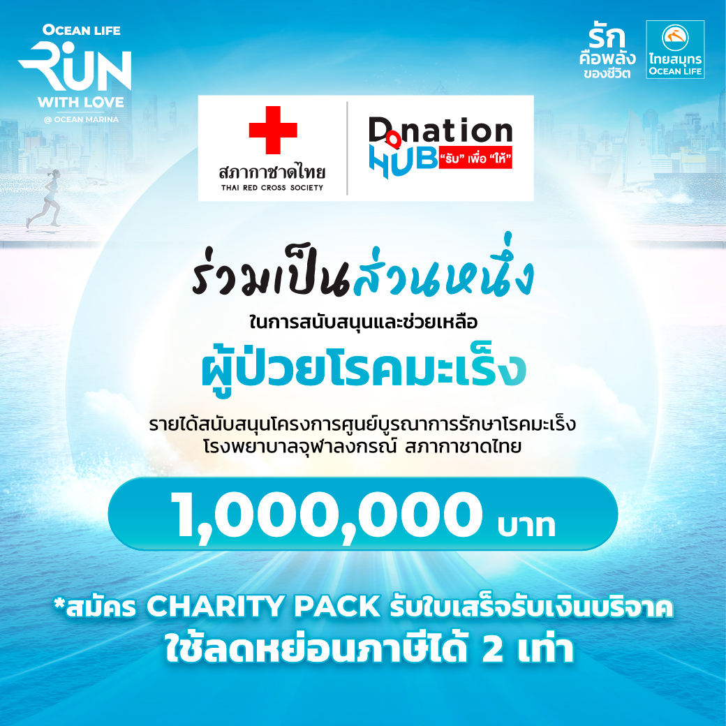 “Ocean Life Run with Love @Ocean Marina” จัดขึ้นเพื่อส่งเสริมให้ผู้คนรักสุขภาพ และช่วยสร้างจิตสำนึกในการดูแลรักษาสิ่งแวดล้อม เพื่อโลกที่ดีกว่าให้กับคนรุ่นต่อไป อีกทั้งนำรายได้จำนวน 1,000,000 บาท บริจาคสมทบทุนให้กับโครงการอาคารศูนย์บูรณาการรักษาโรคมะเร็ง โรงพยาบาลจุฬาลงกรณ์ สภากาชาดไทย