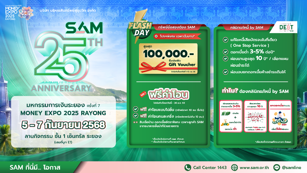 3 กันยายน 2568 : บริษัท บริหารสินทรัพย์สุขุมวิท จำกัด (บสส.) หรือ SAM ยกขบวนทรัพย์มือสอง(NPA)บนทำเลดีทั่วไทยมากกว่า 4,500 รายการ เข้าร่วมงานมหกรรมการเงินระยอง ครั้งที่ 7 MONEY EXPO 2025 RAYONG ระหว่างวันที่ 5-7 กันยายนนี้ ณ ลานกิจกรรม ชั้น 1 เซ็นทรัล ระยอง บูทหมายเลข E1