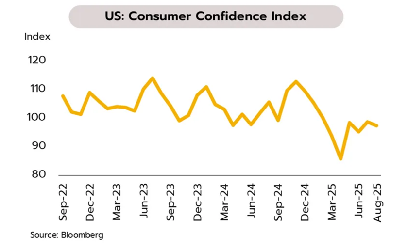 ตัวเลขเศรษฐกิจสหรัฐฯ ที่อ่อนแอต่อเนื่อง หนุนโอกาสเฟดลดดอกเบี้ยเดือนกันยายน ดัชนีความเชื่อมั่นผู้บริโภคลดลงเล็กน้อยสู่ระดับ 97.4 ในเดือนสิงหาคม ต่ำกว่าค่าเฉลี่ยในปี 2566-67 ที่ 105 ส่วนจำนวนผู้ขอรับสวัสดิการว่างงานอยู่ที่ 1.95 ล้านราย เพิ่มขึ้นอย่างมีนัยสำคัญจากต้นปี 2568 ที่ 1.87 ล้านราย ด้านราคาบ้านในเดือนมิถุนายนชะลอตัวมากสุดในรอบเกือบ 13 ปี ขณะที่อัตราเงินเฟ้อ PCE ทรงตัวที่ 2.6% YoY ในเดือนกรกฎาคม