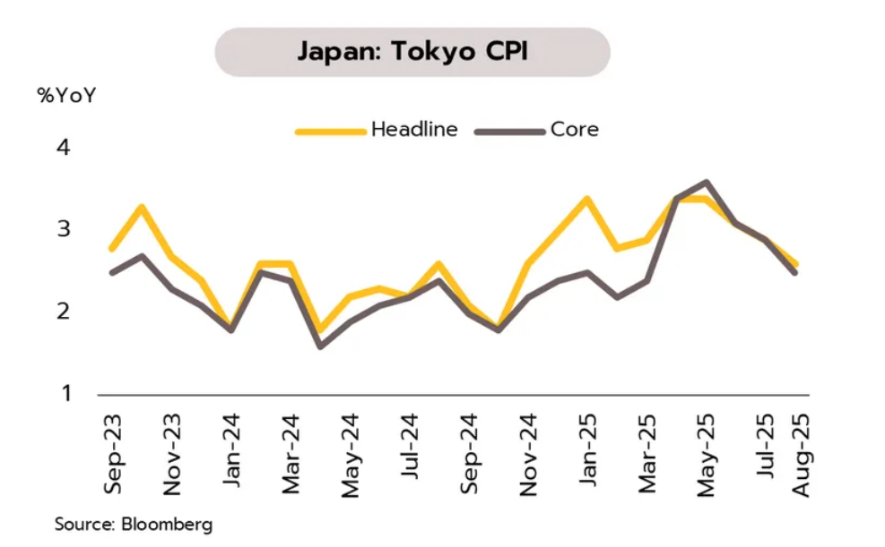 ภาคส่งออกและการผลิตมีแนวโน้มหดตัวแรงขึ้น ขณะที่การบริโภคยังไม่ฟื้น คาดหนุน BOJ คงดอกเบี้ยที่ 0.5% จนถึงสิ้นปี ยอดค้าปลีกในเดือนกรกฎาคมโตต่ำสุดนับตั้งแต่เดือนกุมภาพันธ์ 2565 ที่ 0.3% YoY ขณะที่อัตราเงินเฟ้อทั่วไปของกรุงโตเกียว (Tokyo CPI) ชะลอลงเหลือ 2.6% ในเดือนสิงหาคม จากเดือนก่อนที่ 2.9% เช่นเดียวกับอัตราเงินเฟ้อพื้นฐานของกรุงโตเกียว (Tokyo core CPI) ชะลอลงสู่ระดับ 2.5% จากเดือนก่อนที่ 2.9%