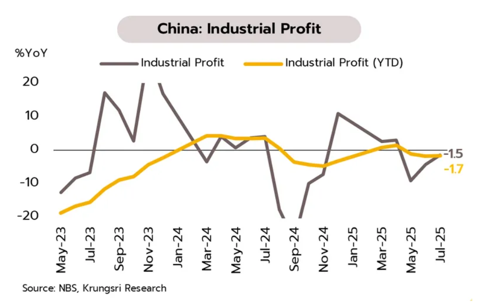 เศรษฐกิจจีนเผชิญความเปราะบางภายในประเทศ ขณะที่ความเสี่ยงจากภายนอกเพิ่มสูงขึ้น กำไรภาคอุตสาหกรรมหดตัวต่อเนื่องที่ -1.5% YoY ในเดือนกรกฎาคม จาก -4.3% ในเดือนมิถุนายน ขณะที่ดัชนีราคาผู้ผลิตลดลงต่อเนื่องนาน 34 เดือน สำหรับปัจจัยภายนอก เม็กซิโกประกาศเตรียมขึ้นภาษีนำเข้าสินค้าจากจีนหลังเผชิญแรงกดดันจากสหรัฐฯ ต่อเนื่อง โดยคาดว่าจะครอบคลุมยานยนต์ สิ่งทอ และพลาสติก