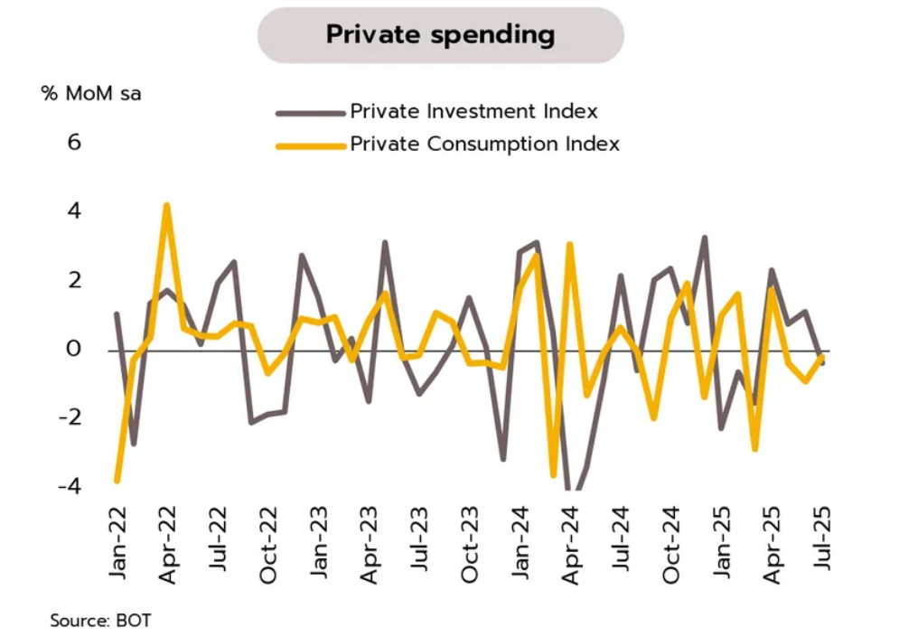 เศรษฐกิจในเดือนกรกฎาคมชะลอลงจากเดือนก่อนตามภาคท่องเที่ยวและการใช้จ่ายภาคเอกชน ขณะที่ปัจจัยการเมืองในประเทศยังต้องติดตามพัฒนาการ ธนาคารแห่งประเทศไทย (ธปท.) รายงานเศรษฐกิจโดยรวมในเดือนกรกฏาคม จำนวนนักท่องเที่ยวต่างชาติแม้เพิ่มขึ้นจากเดือนก่อน (+2.0% MoM sa) แต่รายรับจากนักท่องเที่ยวต่างชาติหดตัว (-5.6%) ขณะเดียวกันการบริโภคภาคเอกชนแผ่วลงต่อเนื่อง (-0.2%) จากการหดตัวของการใช้จ่ายในหมวดบริการและหมวดสินค้าไม่คงทน ส่วนการลงทุนภาคเอกชนกลับมาหดตัว (-0.4%) จากการลดลงในหมวดเครื่องจักรและอุปกรณ์ ขณะที่มูลค่าการส่งออกสินค้าไม่รวมทองคำเพิ่มขึ้นเพียงเล็กน้อย (+0.3%)