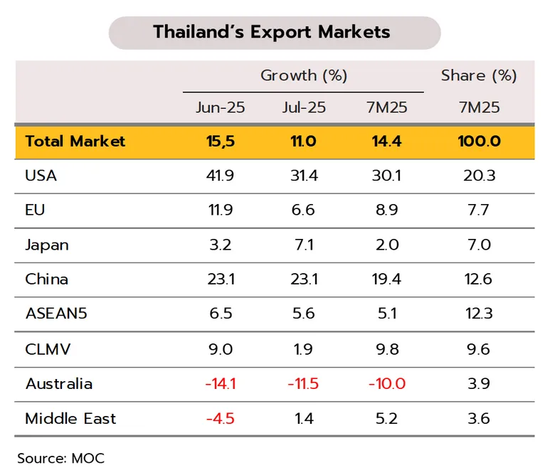 มูลค่าส่งออกเดือนกรกฏาคมในรูปดอลลาร์ยังเติบโตสูงต่อเนื่อง แต่ในรูปเงินบาทกลับหดตัวเป็นครั้งแรกในรอบ 8 เดือน สะท้อนแรงส่งทางเศรษฐกิจอ่อนแอลง กระทรวงพาณิชย์รายงานมูลค่าส่งออกในเดือนกรกฎาคมอยู่ที่ 28.6 พันล้านดอลลาร์ ขยายตัว 11.0% YoY หากหักสินค้าที่เกี่ยวเนื่องกับน้ำมัน และทองคำ การส่งออกเติบโต 16.6% โดยการส่งออกสินค้าสำคัญที่ขยายตัว อาทิ เครื่องคอมพิวเตอร์และอุปกรณ์ ฮาร์ดดิสก์ไดร์ฟ แผงวงจรไฟฟ้า รวมถึงสินค้าเกษตรโดยเฉพาะผลไม้สด แช่เย็น แช่แข็งและแห้งที่กลับขยายตัวได้ดี ด้านตลาดส่งออกพบว่าตลาดสำคัญส่วนใหญ่เติบโตดี โดยเฉพาะตลาดหลัก เช่น สหรัฐฯ จีน สหภาพยุโรป และอาเซียน สำหรับในช่วง 7 เดือนแรกของปี 2568 มูลค่าการส่งออกอยู่ที่ 195.4 พันล้านดอลลาร์ ขยายตัว 14.4%