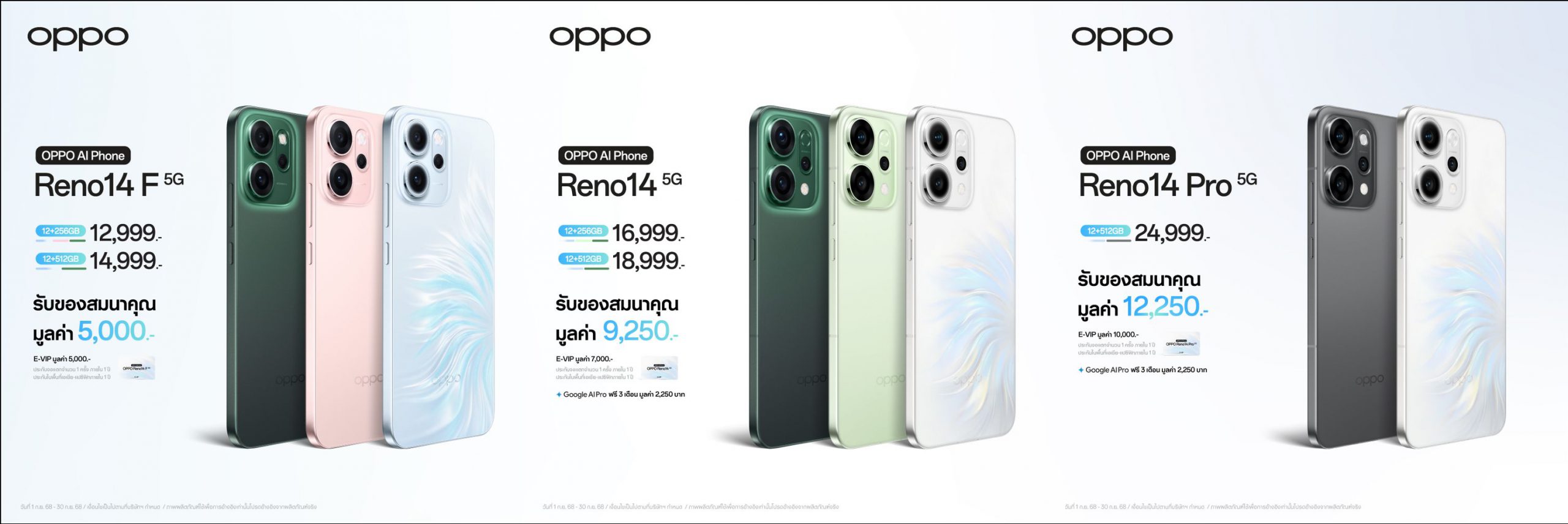 สำหรับลูกค้าที่ซื้อ OPPO Reno14 Pro 5G จะได้รับของสมนาคุณมูลค่าสูงสุด 12,250 บาท E-VIP ประกันจอแตกจำนวน 1 ครั้ง ภายในระยะเวลา 1 ปีและประกันในพื้นที่เอเชีย-แปชิฟิก (นับจากวันที่ซื้อเครื่อง ผลบังคับใช้ 1 ปี) มูลค่า 10,000 บาท และสิทธิ์ Google AI Pro ฟรี 3 เดือน มูลค่า 2,250 บาท