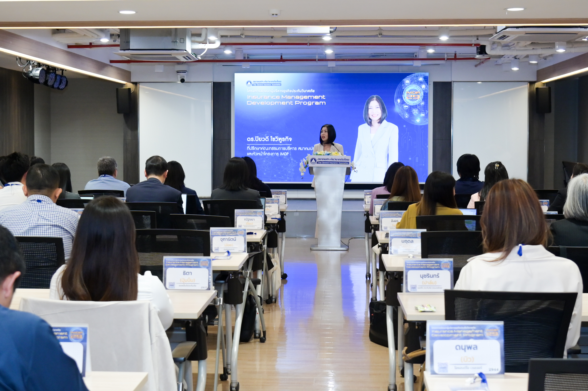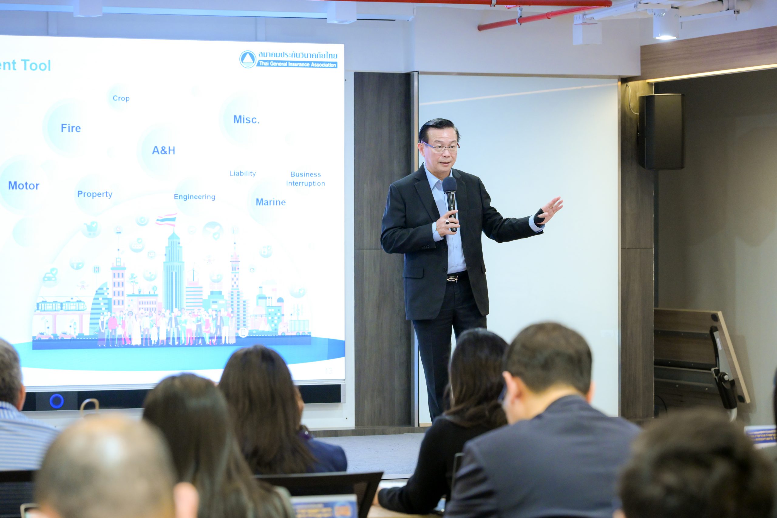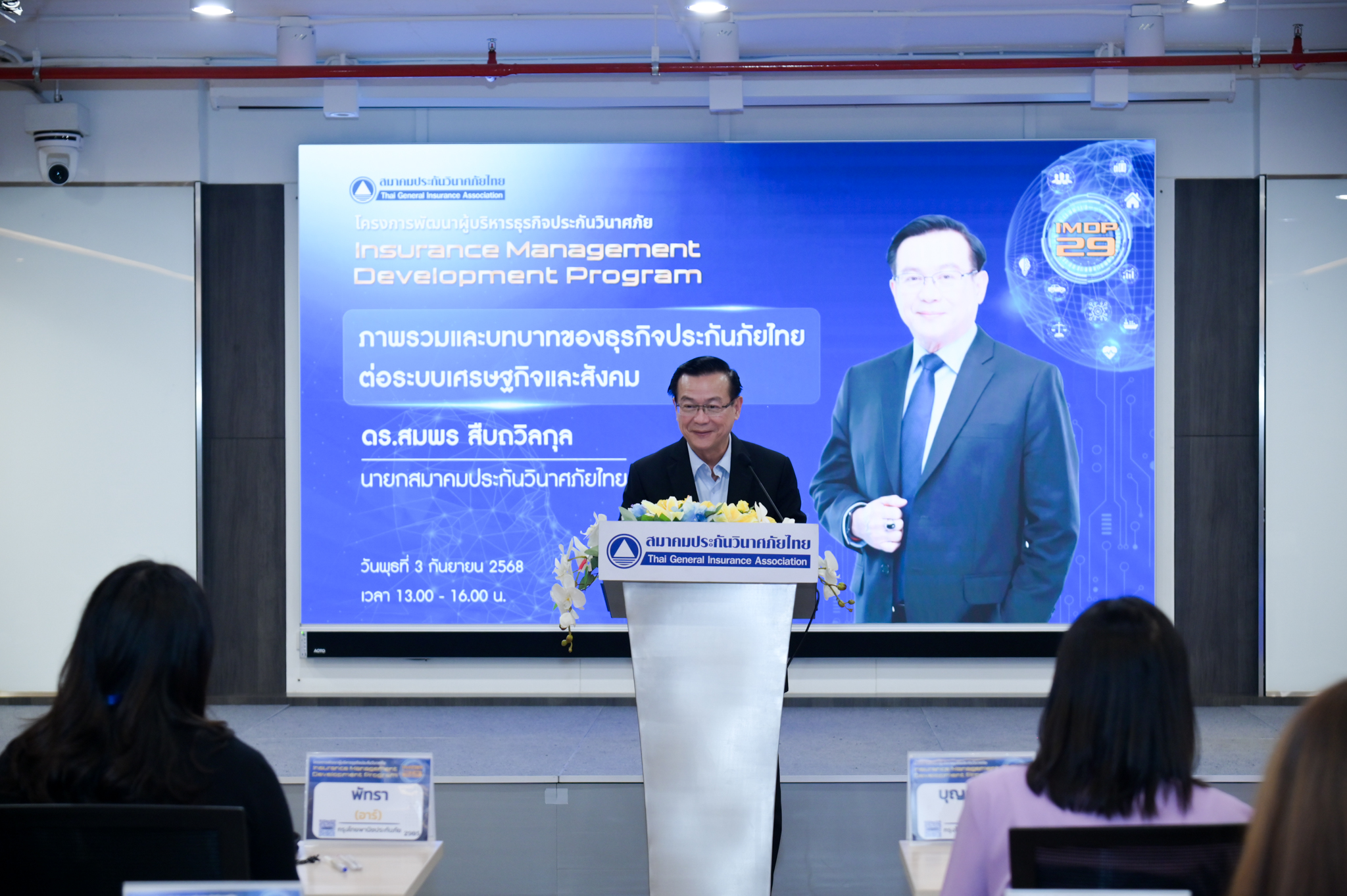 5 กันยายน 2568 : ดร.สมพร สืบถวิลกุล นายกสมาคมประกันวินาศภัยไทย เป็นประธานในพิธีเปิดการอบรมโครงการพัฒนาผู้บริหารธุรกิจประกันวินาศภัย (Insurance Management Development Program : IMDP) รุ่นที่ 29 พร้อมบรรยายพิเศษหัวข้อ “ภาพรวมและบทบาทของธุรกิจประกันภัยไทยต่อระบบเศรษฐกิจและสังคม” และได้รับเกียรติจาก นายชูฉัตร ประมูลผล เลขาธิการ คปภ. ร่วมบรรยายพิเศษหัวข้อ “ทิศทางการกำกับและส่งเสริมธุรกิจประกันวินาศภัยไทย” ซึ่งโครงการดังกล่าวจัดโดยคณะกรรมการพัฒนาธุรกิจและวิชาการประกันภัย เพื่อพัฒนาความรู้ ทักษะ และขีดความสามารถของผู้บริหารในธุรกิจประกันวินาศภัยให้ก้าวสู่การเป็นผู้บริหารความเสี่ยงมืออาชีพ โดยมีผู้เข้ารับการอบรมรวม 56 คน จากบริษัทประกันภัย บริษัทนายหน้าประกันภัย และสำนักงาน คปภ. ระยะเวลาการอบรมตั้งแตวันที่ 3 กันยายน 2568 ถึง 30 พฤศจิกายน 2568 เมื่อวันที่ 3 กันยายน 2568 ณ ห้องสัมมนา 501 สมาคมประกันวินาศภัยไทย