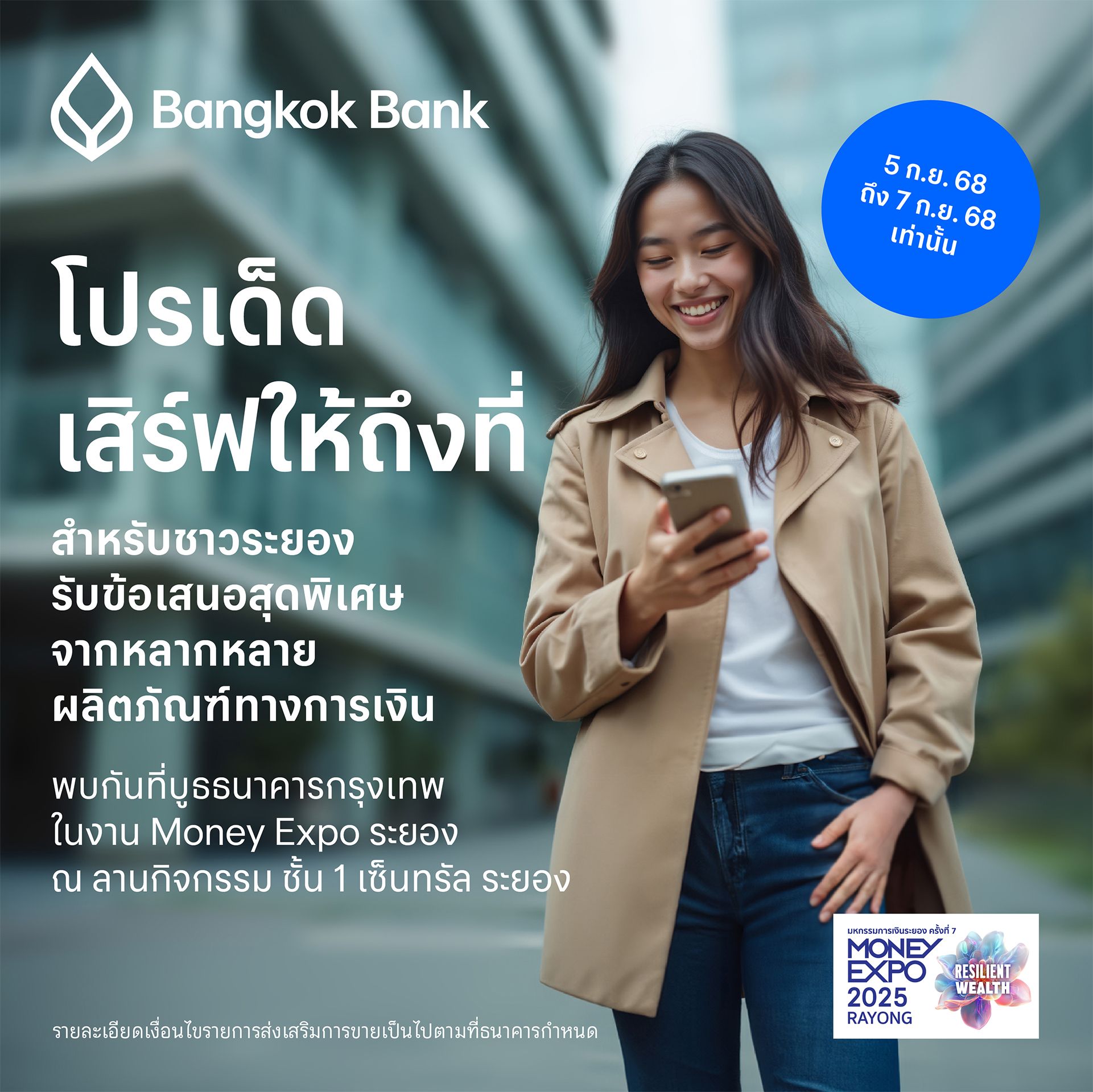 สำหรับลูกค้า และผู้สนใจขอรับคำปรึกษาด้านการเงิน การลงทุน ตลอดจนสมัครบริการต่างๆ พร้อมรับโปรโมชันพิเศษ ได้ที่บูธธนาคารกรุงเทพ ในงานมหกรรมการเงินระยอง ครั้งที่ 7 (Money Expo Rayong 2025) ระหว่างวันที่ 5-7 กันยายน 2568 ณ ลานกิจกรรม ชั้น 1 ศูนย์การค้าเซ็นทรัล ระยอง