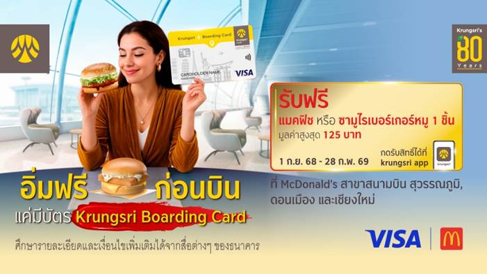 8 กันยายน 2568 : กรุงศรี (ธนาคารกรุงศรีอยุธยา จำกัด (มหาชน)) มอบสิทธิพิเศษสำหรับผู้ถือบัตร Krungsri Boarding Card ที่สมัครและเปิดใช้บัตร (Activate card) ก่อนวันที่ 1 กันยายน 2568 และยังคงสถานะการใช้งานอยู่ รับฟรี แมคฟิช หรือ ซามูไรเบอร์เกอร์หมู 1 ชิ้น มูลค่าสูงสุด 125 บาท ที่ McDonald’s สาขาสนามบิน สุวรรณภูมิ, ดอนเมือง และเชียงใหม่ โดยสามารถกดรับสิทธิ์ผ่าน krungsri app เมนูสิทธิประโยชน์ ภายในระยะเวลาที่กำหนด พร้อมแสดงบัตร Krungsri Boarding Card เพื่อรับสิทธิ์กับพนักงานของ McDonald’s ตั้งแต่วันที่ 1 กันยายน 2568 – 28 กุมภาพันธ์ 2569