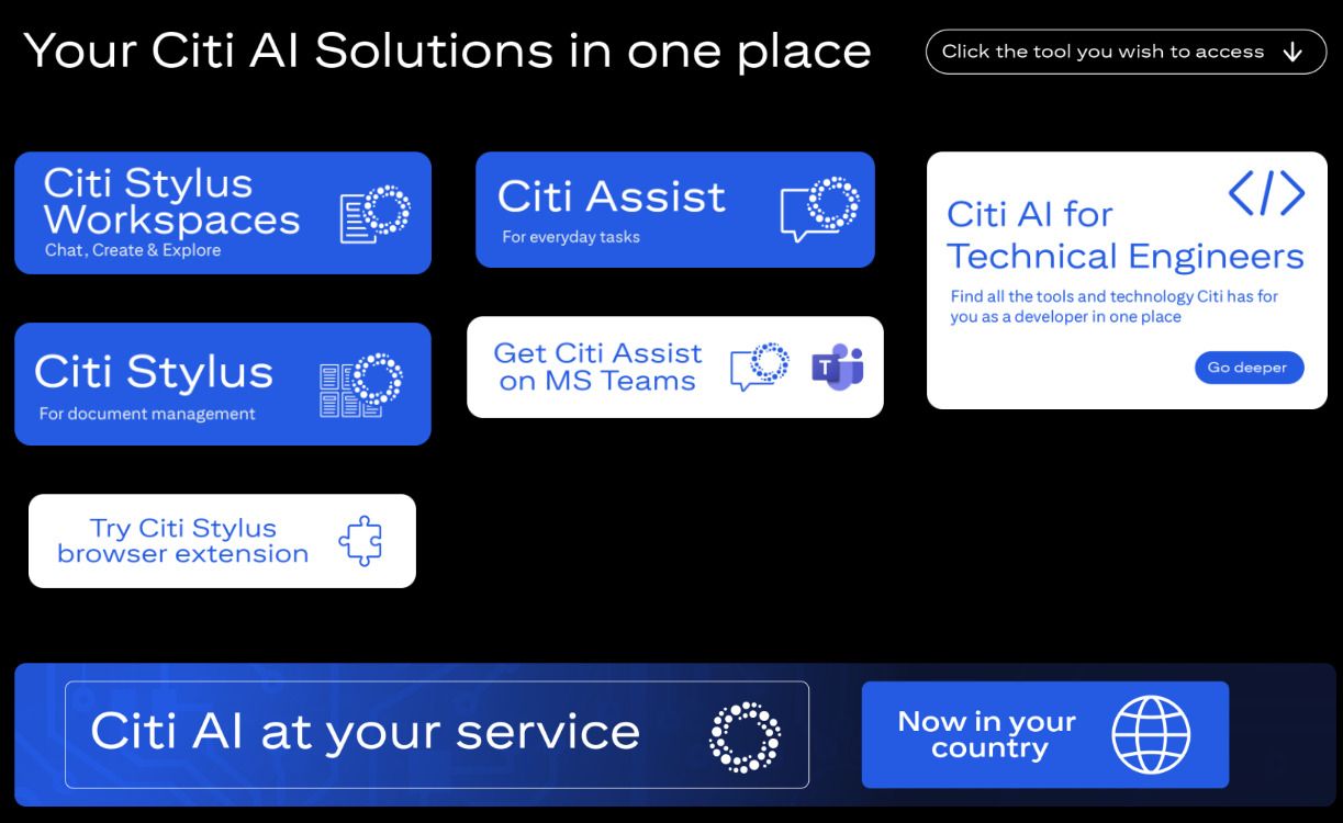 - Cit Assist ผู้ช่วยอัจฉริยะบนเดสก์ท็อปที่ช่วยให้พนักงานตรวจสอบนโยบาย รวมถึงค้นหาข้อมูลเกี่ยวกับกฎระเบียบข้อบังคับ ความเสี่ยง ทรัพยากรบุคคล และการเงินได้อย่างสะดวกจากคลังข้อมูลของซิตี้แบงก์ พร้อมแผนขยายฐานข้อมูลเพิ่มเติมในอนาคต