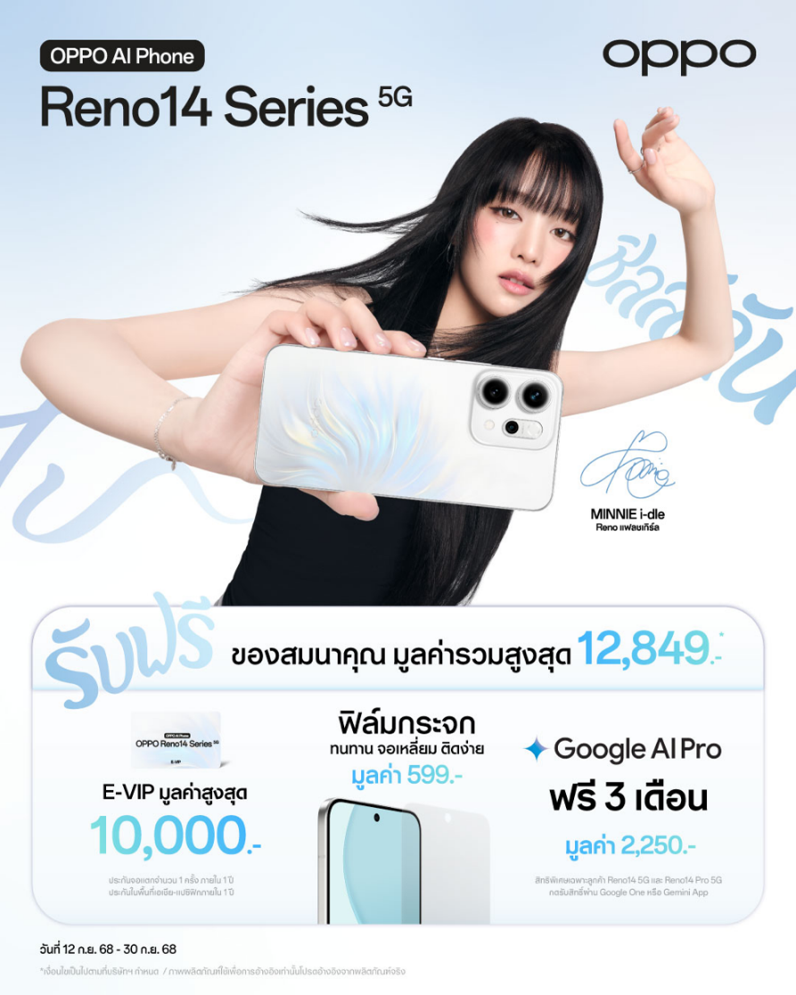 กรุงเทพฯ,12 กันยายน 2568 : ออปโป้ ประเทศไทย จัดโปรโมชันสุดคุ้มสำหรับ OPPO Reno14 Series 5G เอาใจแฟนๆ สายชอบพอร์ตเทรต สมาร์ตโฟนที่ช่วยยกระดับการถ่ายพอร์ตเทรตด้วย AI ให้สวยขึ้นไปอีกขั้น โดยผู้ที่ซื้อสมาร์ตโฟน OPPO Reno14 Series 5G มาพร้อมโปรโมชันสุดพิเศษสำหรับเดือนกันยายนนี้เท่านั้น ตั้งแต่วันที่ 12-30 กันยายน 2568 จะได้รับของสมนาคุณฟรีไปเลย! ฟิล์มกระจก ทนทาน จอเหลี่ยม ติดง่าย และสิทธิประโยชน์มากมาย มูลค่ารวมสูงสุดถึง 12,849 บาท!