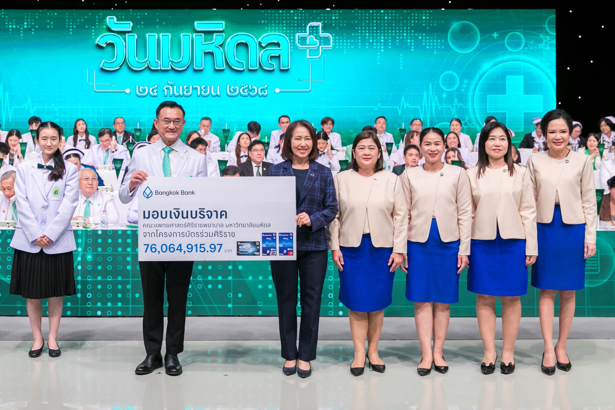 15 กันยายน 2568 : พจณี คงคาลัย ผู้ช่วยผู้จัดการใหญ่ บริหารความสัมพันธ์และการขาย (ที่ 5 จากขวา) รัตตพร ฉายาสิริวงศ์ เจ้าหน้าที่บริหารระดับ Vice President สนับสนุนระบบงานพิธีการอิเล็กทรอนิกส์ (ที่ 2 จากขวา) ศิริกุล ไชยสิงห์ ผู้จัดการภาคนครหลวง 3 (ที่ 4 จากขวา) นริสา เหล่าพานิช ผู้จัดการสาขาสะพานพระปิ่นเกล้า (ขวาสุด) ธนาคารกรุงเทพ จำกัด (มหาชน) ในฐานะผู้แทนธนาคารส่งมอบเงินบริจาค จำนวน 76,064,915.97 บาท ที่มาจาก “โครงการบัตรร่วมศิริราช ธนาคารกรุงเทพ” ที่ผู้ถือบัตรเป็น “ผู้ให้” สร้างคุณประโยชน์ทางการแพทย์ในทุกยอดการใช้จ่าย ระหว่างวันที่ 1 กันยายน 2567 – 31 สิงหาคม 2568 แก่ ศาสตราจารย์ นายแพทย์อภิชาติ อัศวมงคลกุล คณบดี คณะแพทยศาสตร์ศิริราชพยาบาล มหาวิทยาลัยมหิดล (ซ้ายสุด) ในงาน “วันมหิดล” เพื่อสมทบทุนช่วยผู้ป่วยด้อยโอกาส จัดซื้ออุปกรณ์ทางการแพทย์และพัฒนาศูนย์ความเป็นเลิศทางการแพทย์ศิริราช และรำลึกถึงพระมหากรุณาธิกรุณาธิคุณของสมเด็จพระมหิตลาธิเบศร อดุลยเดชวิกรม พระบรมราชชนก “พระบิดาแห่งการแพทย์แผนปัจจุบันของไทย”