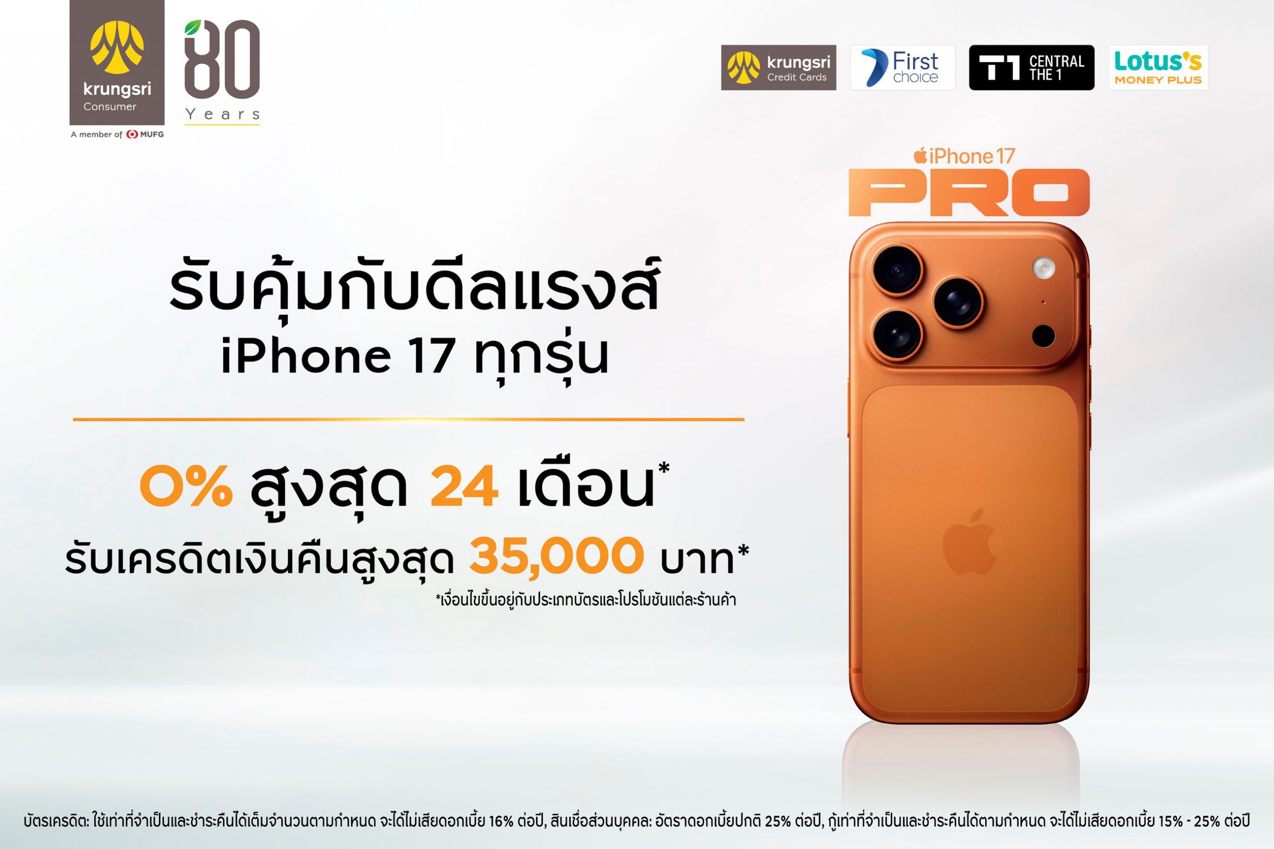 พิเศษ! สำหรับบัตรเครดิตกรุงศรีเฟิร์สช้อยส์และบัตรเครดิต กรุงศรี แลกคะแนนเท่ายอดซื้อ รับเครดิตเงินคืนเพิ่มสูงสุด 17% สอบถามรายละเอียดโปรโมชันและเงื่อนไข ณ ร้านค้าที่ร่วมรายการ ได้แก่ Apple Store, AIS, TRUE, DTAC, Studio7, Banana IT, iStudio, .Life, Advice, TG, Jaymart, JIB., Power Buy, Power Mall เงื่อนไขเป็นไปตามที่กำหนด ข้อมูลเพิ่มเติม https://www.firstchoice.co.th/ksc-iphone-17 ทั้งนี้ บัตรเครดิต : ใช้เท่าที่จำเป็นและชำระคืนได้เต็มจำนวนตามกำหนด จะได้ไม่เสียดอกเบี้ย 16% ต่อปี, สินเชื่อส่วนบุคคล : อัตราดอกเบี้ยปกติ 25% ต่อปี, กู้เท่าที่จำเป็นและชำระคืนได้ตามกำหนด จะได้ไม่เสียดอกเบี้ย 15% - 25% ต่อปี