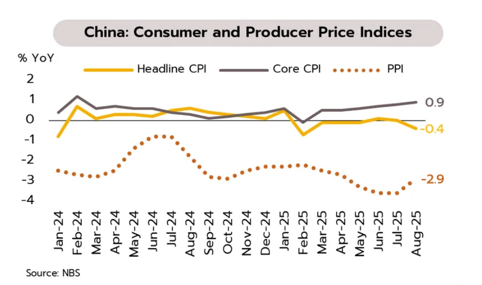 จีนเผชิญแรงกดดันจากภายนอกเพิ่มมากขึ้น การส่งออกในเดือนสิงหาคมขยายตัวต่ำสุดในรอบ 6 เดือนที่ 4.4% YoY ขณะที่การส่งออกไปยังสหรัฐฯ หดตัวเร่งขึ้นจาก -21.7% ในเดือนกรกฎาคมเป็น -33.1% ในเดือนสิงหาคม ส่วนการส่งออกไปยังคู่ค้าสำคัญอื่นยังขยายตัวได้สูง เช่น อาเซียน (+22.5%) และสหภาพยุโรป (+10.4%) ขณะเดียวกันอัตราเงินเฟ้อทั่วไปยังคงต่ำกว่า 1% นานติดต่อกัน 30 เดือน อีกด้านหนึ่ง เม็กซิโกประกาศขึ้นภาษีนำเข้าสินค้าจากจีนเป็น 50% สำหรับรถยนต์ 35% สำหรับเหล็ก ของเล่นและมอร์เตอร์ไซด์ และ 10-50% สำหรับสิ่งทอ