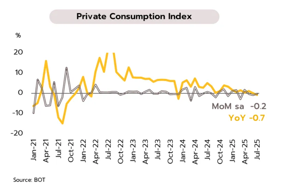 ความเชื่อมั่นผู้บริโภคที่ปรับลดลงต่อเนื่องจนแตะระดับต่ำสุดในรอบเกือบ 3 ปี เป็นสัญญาณสะท้อนถึงแรงกดดันต่อการใช้จ่ายภาคครัวเรือน สอดคล้องกับตัวเลขดัชนีการบริโภคภาคเอกชน (PCI) ซึ่งธปท. รายงานว่าในเดือนกรกฎาคมหดตัวติดต่อกันเป็นเดือนที่ 3 ที่ -0.2% MoM ท่ามกลางความไม่แน่นอนทางการเมือง ภาคท่องเที่ยวที่ฟื้นตัวช้า และการลดลงของรายได้เกษตรกรที่ได้รับผลกระทบจากราคาสินค้าเกษตรตกต่ำ อย่างไรก็ตาม ล่าสุดรัฐบาลชุดใหม่เตรียมนำมาตรการกระตุ้นการใช้จ่าย เช่น โครงการ “คนละครึ่ง” กลับมาใช้อีกครั้ง