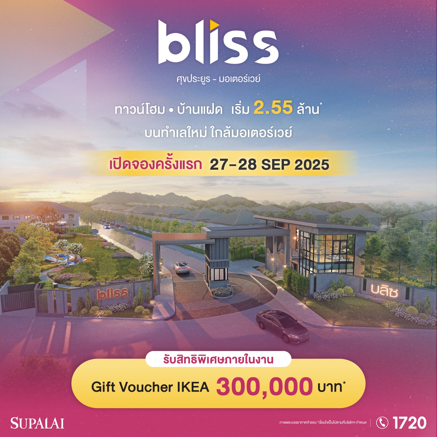 สัมผัสชีวิตเหนือระดับบนทำเลศักยภาพที่เชื่อมต่อมอเตอร์เวย์ได้เพียง 5 นาที กับ 2 โครงการบ้านคุณภาพทั้ง ศุภาลัย เลควิลล์ ศุขประยูร-มอเตอร์เวย์ และบลิซ ศุขประยูร-มอเตอร์เวย์ ในงาน PRE-SALES ระหว่างวันที่ 27–28 กันยายน 2568 ณ สำนักงานขายทั้ง 2 โครงการ พร้อมจัดหนัก! โปรโมชันส่วนลด-ของแถมพิเศษสำหรับลูกค้าลงทะเบียน สอบถามข้อมูลเพิ่มเติมโทร. 1720 หรือติดตามรายละเอียดได้ที่ Facebook: Supalai และ ศุภาลัย ชลบุรี ศรีราชา พัทยา