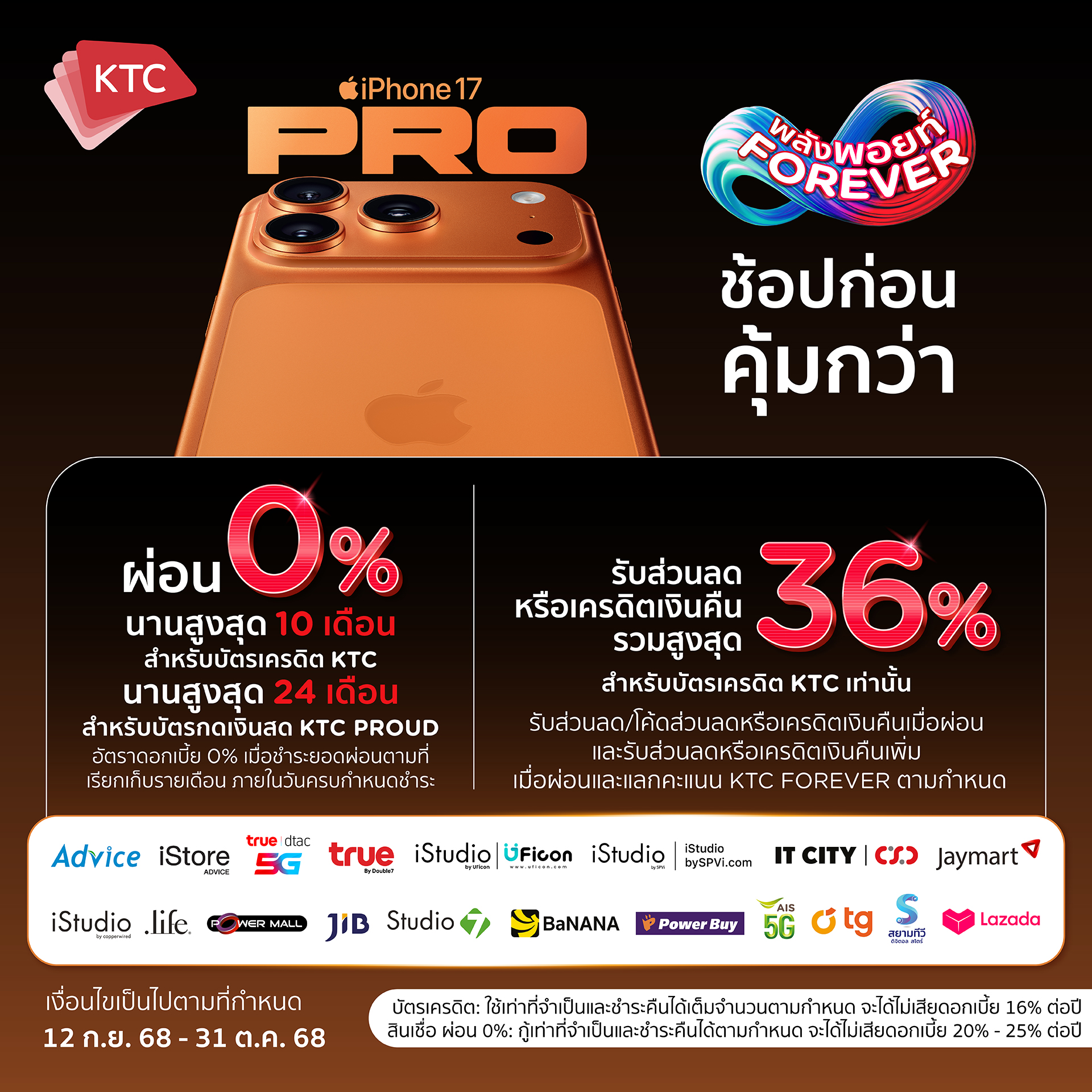 18 กันยายน 2568 : “เคทีซี” หรือ บริษัท บัตรกรุงไทย จำกัด (มหาชน) เปิดตัวแคมเปญพิเศษต้อนรับ iPhone 17 สมาร์ทโฟนรุ่นล่าสุดจาก Apple มอบข้อเสนอสุดคุ้มสูงสุดให้สมาชิกบัตรเครดิตและบัตรกดเงินสด “เคทีซี พราว” เป็นเจ้าของ iPhone 17 ได้ง่ายขึ้น พร้อมสิทธิประโยชน์สูงสุดถึง 30% ตั้งแต่วันที่ 12 กันยายน – 31 ตุลาคม 2568 ที่ร้านมือถือ ไอที และเครื่องใช้ไฟฟ้าชั้นนำทั่วประเทศที่ร่วมรายการ อาทิ Studio7, BaNANA, Power Buy, Jaymart, AIS, TRUE, DTAC, JIB, IT City, Power Mall และ Apple Store ที่ร่วมรายการ