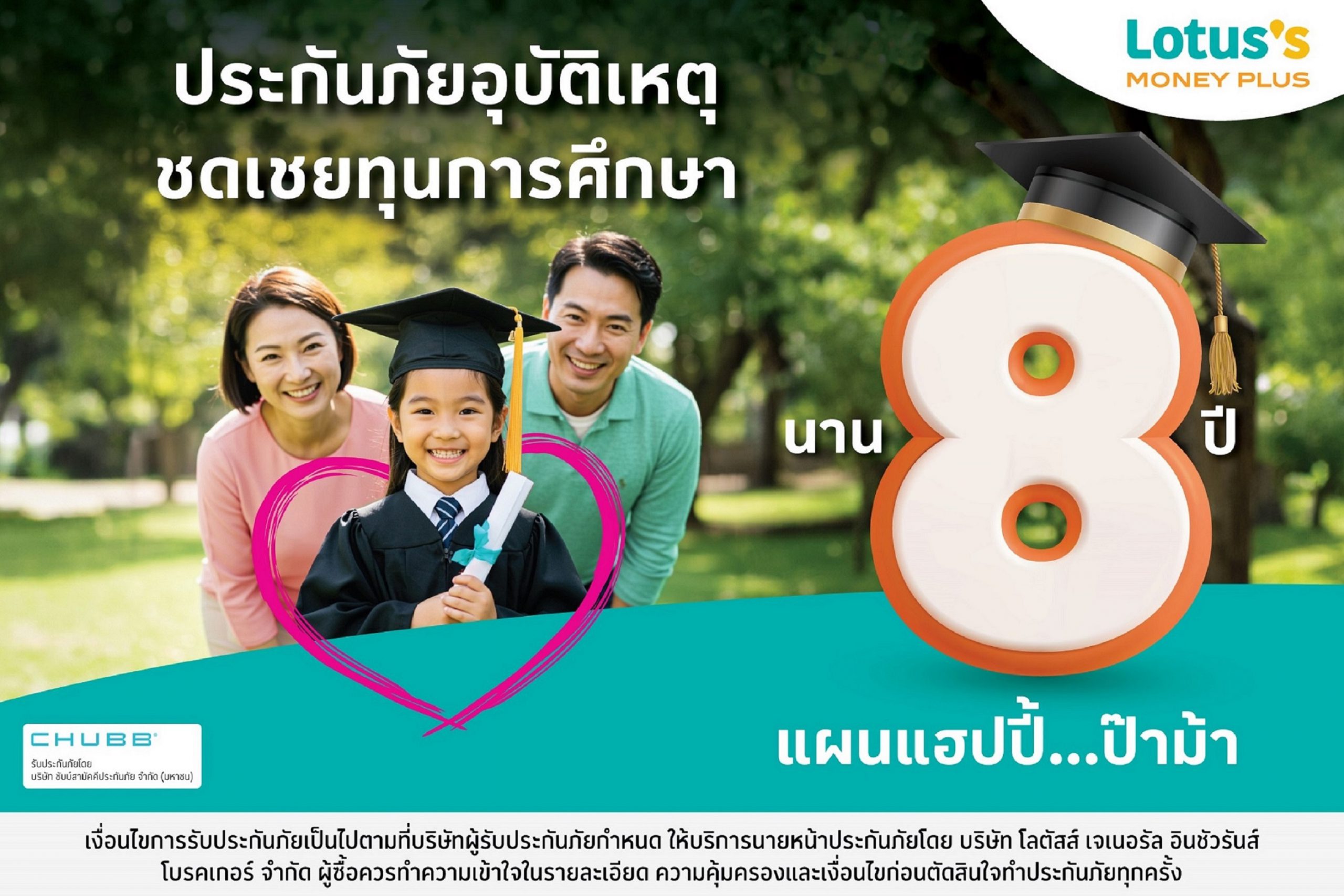 ดังนั้น ลูกค้าเกิน 16% ของโลตัส มันนี่ พลัส จึงเป็นพ่อแม่ยุคใหม่ที่มีความต้องการผลิตภัณฑ์และบริการที่ตอบสนองเรื่องความมั่นคงในชีวิตและสุขภาพของทุกคนในครอบครัว โลตัส มันนี่ พลัส จึงร่วมมือกับชับบ์สามัคคีประกันภัย นำเสนอผลิตภัณฑ์ประกันภัยอุบัติเหตุ “แฮปปี้ ป๊าม้า” ที่ตอบโจทย์พ่อแม่รุ่นใหม่ที่ต้องการสร้างหลักประกันที่มั่นคงให้กับครอบครัวแม้ยามขาดเสาหลักด้วยจุดเด่นผลิตภัณฑ์ที่คุ้มค่า ด้วยความคุ้มครองหลักล้านแต่เบี้ยประกันภัยอยู่ในราคาที่จับต้องได้ เข้าถึงได้สะดวกผ่านเคาน์เตอร์บริการของโลตัส มันนี่ พลัส รวมทั้งยังมีทางเลือกในการชำระเงินที่หลากหลาย โดยโลตัส มันนี่ พลัส ตั้งเป้าเพิ่มจำนวนกรมธรรม์ประกันภัยสำหรับครอบครัวเติบโตกว่า 34% เมื่อเทียบกับปีที่ผ่านมา และเบี้ยประกันภัยรวม 3 ปีแรกกว่า 110 ล้านบาท