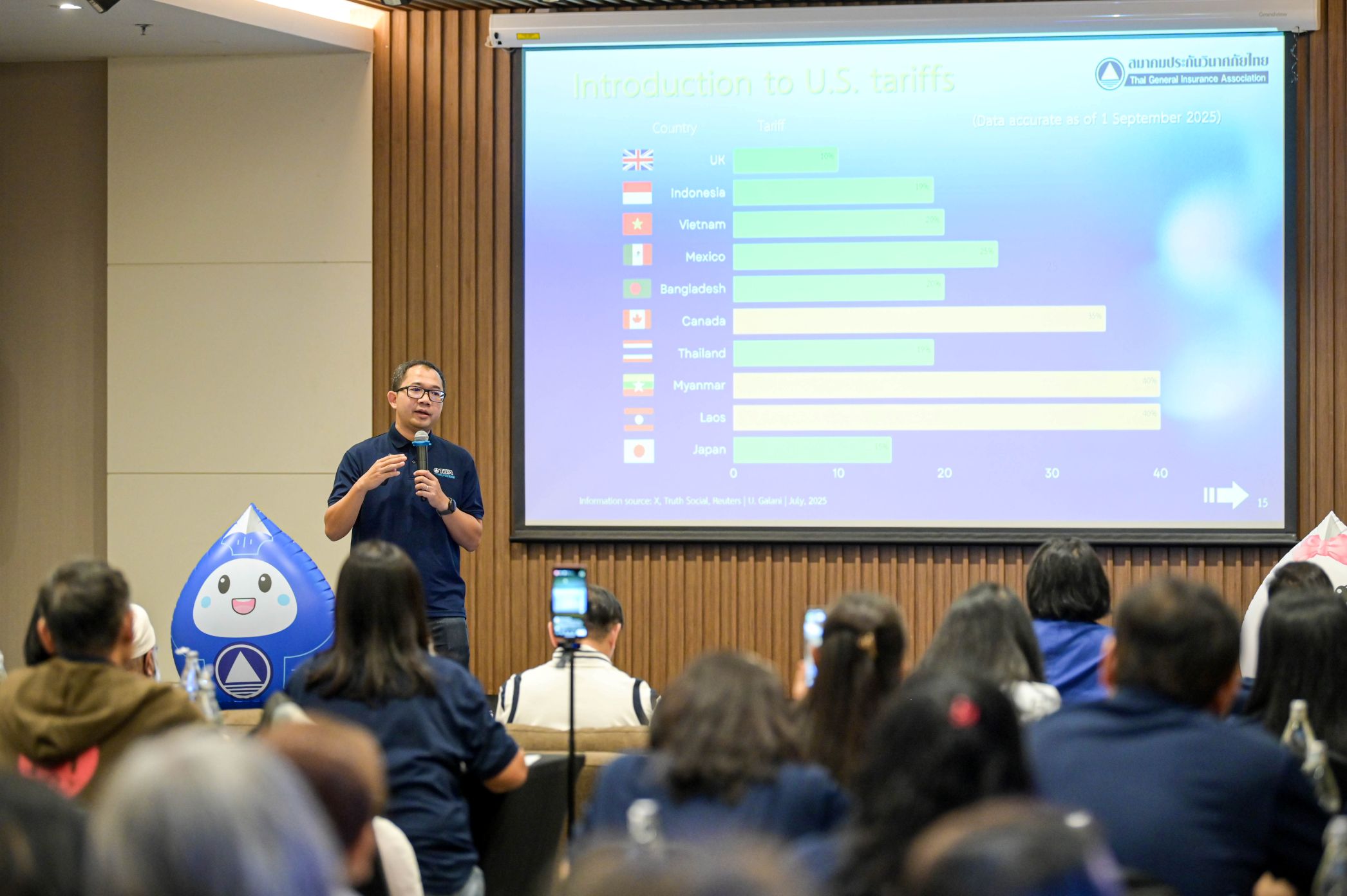 นายจุฑาธวัช เพ็งศรี ประธานคณะกรรมการประกันภัยทางทะเลและโลจิสติกส์ กล่าวถึงการเปลี่ยนแปลงทั่วโลกในหลากหลายด้าน ไม่ว่าจะเป็นมาตรการภาษีตอบโต้ของประธานาธิบดีโดนัลด์ ทรัมป์ ที่ได้จุดชนวนให้เกิดสงครามการค้าที่ส่งผลกระทบต่อเศรษฐกิจโลกอย่างรุนแรง ความตึงเครียดด้านภูมิรัฐศาสตร์ และความขัดแย้งในหลายภูมิภาค ล้วนส่งผลกระทบโดยตรงต่อการค้าและการขนส่งสินค้าระหว่างประเทศอย่างมีนัยสำคัญ