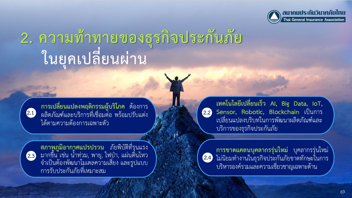 ในมุมของการพัฒนาผลิตภัณฑ์และบริการ นวัตกรรมต้องครอบคลุมหลายมิติ ทั้ง Usage-Based Insurance, Embedded Insurance และ All-in-One Insurance โดยบทบาทของเทคโนโลยี เช่น AI, Big Data, Blockchain, IoT และ Sensor จะมีส่วนสำคัญในการวิเคราะห์ข้อมูลและการบริหารความเสี่ยงเชิงรุก จุดเน้นสำคัญคือการคิดล่วงหน้าและลงมือก่อนที่ปัญหาจะเกิดขึ้น หรือแม้กระทั่งก่อนที่ความต้องการของลูกค้าจะปรากฏชัดเจน