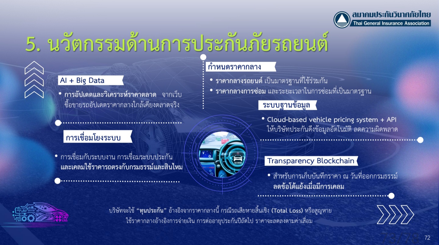 ในด้านการประกันภัยรถยนต์ จำเป็นต้องให้ความสำคัญในการจัดทำ “ราคากลาง” ของรถยนต์และค่าซ่อมแซมโดยใช้ระบบ AI และ Big Data เพื่อปรับปรุงราคากลางให้สอดคล้องกับความเป็นจริงของตลาดในแต่ละช่วงเวลา ทั้งนี้เพื่อเพิ่มความโปร่งใสในการเสนอเบี้ยประกันภัย และลดข้อโต้แย้งในกระบวนการเคลม
