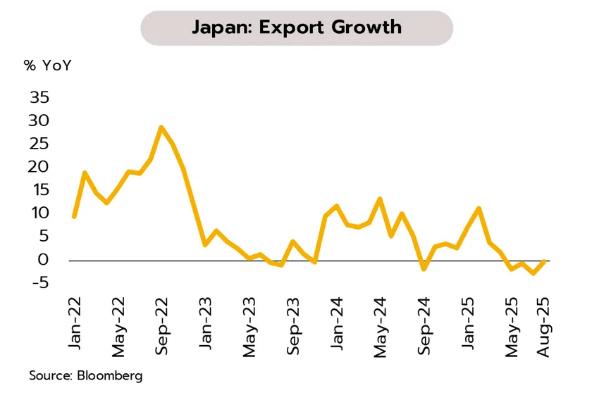เงินเฟ้อที่อยู่ในระดับสูงยังกดดันการบริโภคภายในประเทศ สะท้อนจากยอดค้าปลีกที่ชะลอตัวมากสุดนับตั้งแต่เดือนกุมภาพันธ์ 2565 ท่ามกลางความไม่แน่นอนทางการเมือง ด้านพรรคเสรีประชาธิปไตย (LDP) จะมีการเลือกผู้นำพรรคคนใหม่ในวันที่ 4 ตุลาคม นอกจากนี้ ตัวเลขการส่งออกของญี่ปุ่นในเดือนสิงหาคมหดตัวลงเป็นเดือนที่ 4 ติดต่อกัน สอดคล้องกับ PMI ภาคการผลิตที่ยังอยู่ในโซนหดตัว และมีแนวโน้มที่จะอ่อนแอลงหลังการปรับขึ้นภาษีนำเข้าของสหรัฐฯ เมื่อต้นเดือนสิงหาคม จากปัจจัยดังกล่าวคาดว่าจะช่วยหนุนให้ BOJ ไม่รีบปรับขึ้นอัตราดอกเบี้ยนโยบาย โดยคาดว่าจะคงดอกเบี้ยไว้ที่ระดับ 0.50% จนถึงสิ้นปีนี้