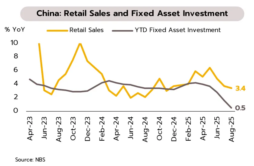 เศรษฐกิจจีนส่งสัญญาณชะลอตัวมากขึ้นสวนทางกับตลาดหลักทรัพย์ โดยยอดค้าปลีกขยายตัวชะลอลงต่อเนื่องจาก 3.7% YoY ในเดือนกรกฎาคมเป็น 3.4% ในเดือนสิงหาคม ผลผลิตภาคอุตสาหกรรมชะลอลงจาก 5.7% เป็น 5.2% การลงทุนในสินทรัพย์ถาวรช่วง 8 เดือนแรกแทบไม่ขยายตัวที่ 0.5% ลดลงอย่างมากจาก 1.6% ในช่วง 7 เดือนแรก ส่วนการลงทุนในภาคอสังหาริมทรัพย์หดตัวแรงขึ้นจาก -12% เป็น -12.9% อีกด้านหนึ่ง Shanghai Composite Index ณ วันที่ 19 กันยายนปรับตัวสูงขึ้น 10.5% เมื่อเทียบกับช่วงต้นเดือนกรกฎาคม