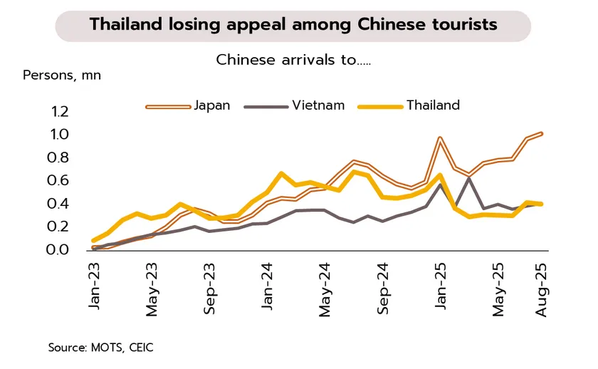 การท่องเที่ยวของไทยยังคงฟื้นตัวอย่างอ่อนแอ โดยมีแรงกดดันสำคัญจากตลาดนักท่องเที่ยวจีนที่หดตัวต่อเนื่อง โดยในเดือนสิงหาคมมีนักท่องเที่ยวจีนเพียง 0.4 ล้านคน ลดลง -37.7% YoY และในช่วง 8 เดือนแรกของปีนี้มีเพียง 3.1 ล้านคน ลดลง -35.3% YoY หรือคิดเป็นเพียงประมาณ 40% ของระดับก่อนการแพร่ระบาดในปี 2562 ปัจจัยดังกล่าวสะท้อนถึงความกังวลด้านความปลอดภัยและการเปลี่ยนแปลงพฤติกรรมการเดินทางของนักท่องเที่ยวจีนที่หันไปเลือกจุดหมายปลายทางอื่นเพิ่มขึ้น ไม่เพียงแต่ญี่ปุ่นเท่านั้นหากยังรวมถึงประเทศในอาเซียน โดยเฉพาะเวียดนามซึ่งในช่วง 8 เดือนแรกของปีนี้สามารถดึงดูดนักท่องเที่ยวจีนได้ถึง 3.5 ล้านคน สูงกว่าไทยอย่างมีนัยสำคัญ รวมถึงมาเลเซียที่ได้รับความนิยมมากขึ้นเช่นกัน